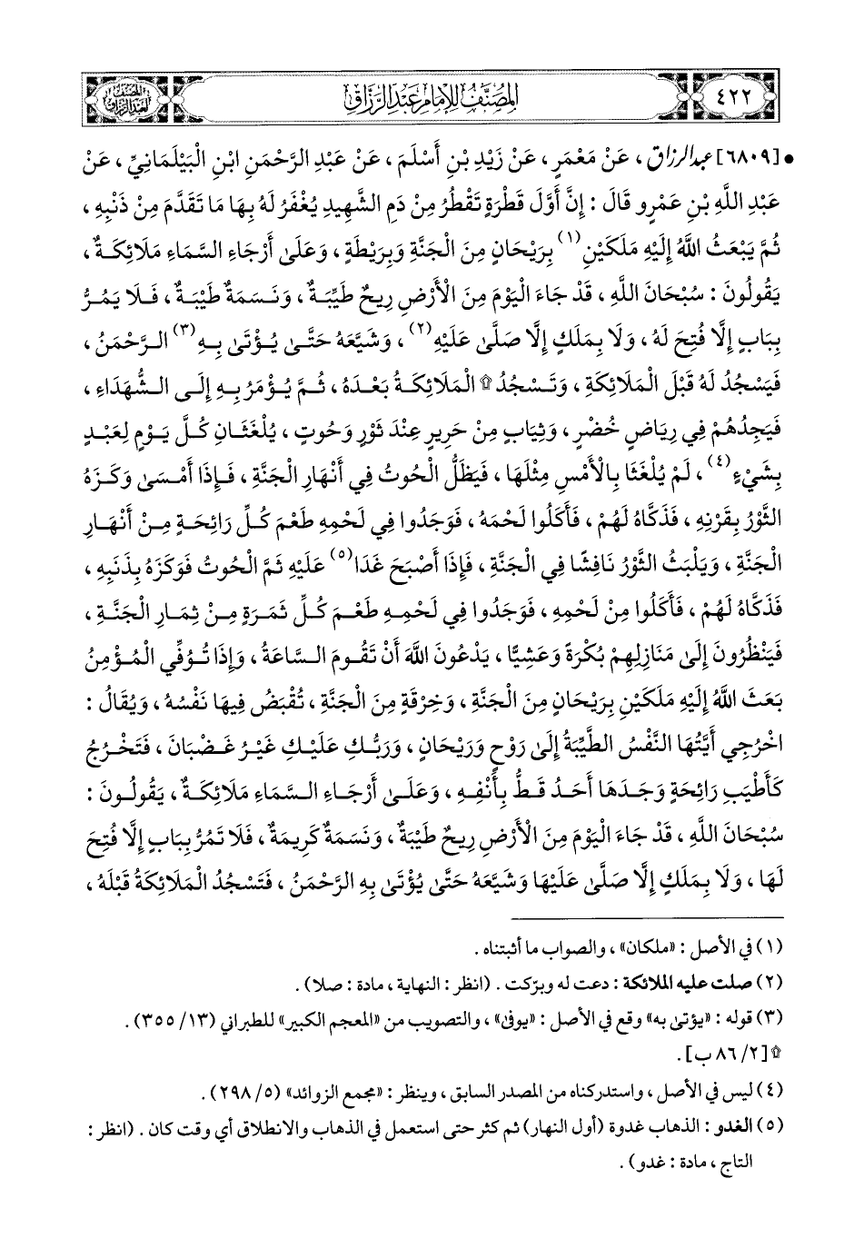 6809- عبد الرزاق، عَنْ مَعْمَرٍ، عَن زَيْدِ بْنِ أَسْلَمَ، عَنْ عَبدِ الرَّحْمَنِ ابْنِ الْبَيْلَمَانِيِّ، عَنْ عَبدِ اللهِ بْنِ عَمْرٍو، قَالَ: إِنَّ أَوَّلَ قَطْرَةٍ تَقْطُرُ مِنْ دَمِ الشَّهِيدِ يُغْفَرُ لَهُ بِهَا مَا تَقَدَّمَ مِنْ ذَنْبِهِ، ثُمَّ يَبْعَثُ اللهُ إِلَيْهِ مَلَكَيْنِ بِرَيْحَانٍ مِنَ الْجَنَّةِ وَبِرَيْطَةٍ، وَعَلَى أَرْجَاءِ السَّمَاءِ مَلاَئِكَةٌ يَقُولُونَ: سُبْحَانَ اللهِ، قَدْ جَاءَ الْيَوْمَ مِنَ الأَرْضِ رِيحٌ طَيِّبَةٌ، وَنَسَمَةٌ طَيْبَةٌ، فَلاَ يَمُرُّ بِبَابٍ إِلاَّ فُتِحَ لَهُ، وَلاَ بِمَلَكٍ إِلاَّ صَلَّى عَلَيْهِ، وَشَيَّعَهُ حَتَّى يُؤْتَى بِهِ الرَّحْمَنَ، فَيَسْجُدُ لَهُ قَبْلَ المَلاَئِكَةِ، وَتَسْجُدُ المَلاَئِكَةُ بَعْدَهُ، ثُمَّ يُؤْمَرُ بِهِ إِلَى الشُّهَدَاءِ، فَيَجِدُهُمْ فِي رِيَاضٍ خَضِرٍ وَثِيَابٍ مِنْ حَرِيرٍ عِنْدَ ثَوْرٍ وَحُوتٍ يُلْغَثَانِ كُلَّ يَوْمٍ لعبد بشيء لَمْ يلغثا بِالأَمْسِ مِثْلَهَا، فَيَظَلُّ الْحُوتُ فِي أَنْهَارِ الْجَنَّةِ، فَإِذَا أَمْسَى وَكَزَهُ الثَّوْرُ بِقَرْنِهِ، فَذَكَّاهُ لَهُمْ، فَأَكَلُوا لَحْمِهِ، فَوَجَدُوا فِي لَحْمِهِ طَعْمَ كُلِّ رَائِحَةٍ مِنْ أَنْهَارِ الْجَنَّةِ، وَيَلْبَثُ الثَّوْرُ نَافِشًا فِي الْجَنَّةِ،.
