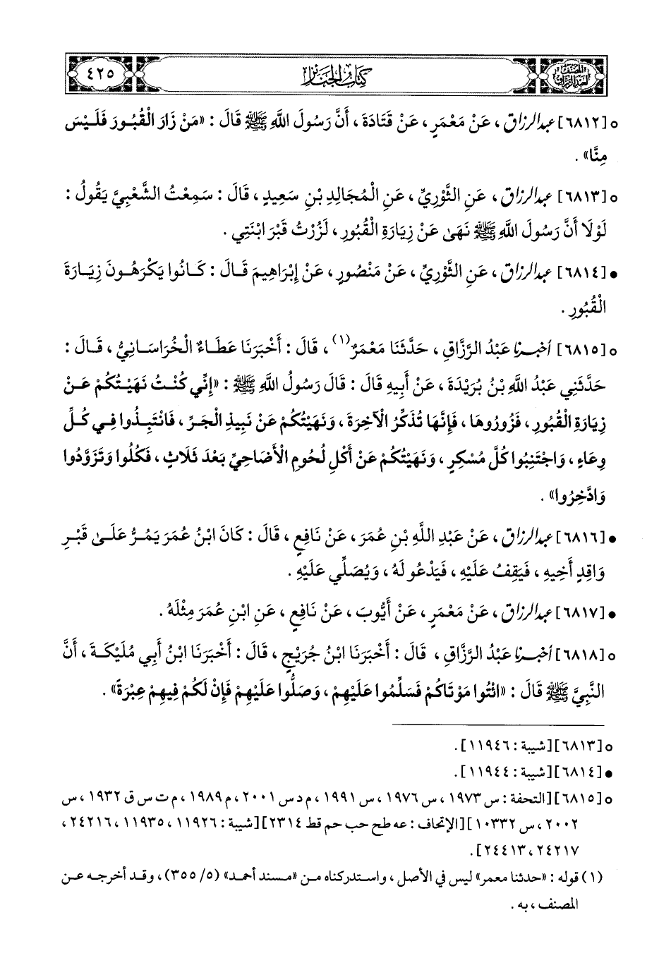 6812- عبد الرزاق، عَنْ مَعْمَرٍ، عَن قَتَادَةَ، أَنَّ رَسُولَ اللهِ صَلَّى اللهُ عَلَيْهِ وَسَلَّمَ قَالَ: مَنْ زَارَ الْقُبُورَ فَلَيْسَ مِنَّا.