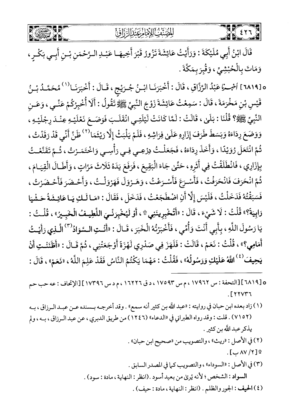 6819- أخبرنا عبد الرزاق، قَالَ: أَخْبَرَنَا ابْنُ جُرَيْجٍ، قَالَ: أَخْبَرَنَا مُحَمَّدُ بن قَيْسِ بْنِ مَخْرَمَةَ، قَالَ: سَمِعْتُ عَائِشَةَ، زَوْجَ النَّبِيِّ صَلَّى اللهُ عَلَيْهِ وَسَلَّمَ تَقُولُ: أَلاَ أُخْبِرُكُمْ عَنِّي وَعَنِ النَّبِيِّ صَلَّى اللهُ عَلَيْهِ وَسَلَّمَ؟ قُلْنَا: بَلَى، قَالَتْ: لَمَّا كَانَتْ لَيْلَتِي انْقَلَبَ، فَوَضَعَ نَعْلَيْهِ عِنْدَ رِجْلَيْهِ، وَوَضَعَ رِدَاءهَ وبَسَطَ طَرَفَ إِزَارِهِ عَلَى فِرَاشِهِ، فَلَمْ يَلْبَثْ إِلاَّ رَيْثَما ظَنَّ أَنِّي قَدْ رَقَدْتُ، ثُمَّ انْتَعَلَ رُوَيْدًا، وَأَخَذَ رِدَاءَهُ، فَجَعَلْتُ دِرْعِي فِي رَأْسِي وَاخْتَمَرْتُ، ثُمَّ تَقَنَّعْتُ بِإِزَارِي، فَانْطَلَقْتُ فِي أَثَرِهِ، حَتَّى جَاءَ الْبَقِيعَ، فَرَفَعَ يَدَهُ ثَلاَثَ مَرَّاتٍ، وَأَطَالَ الْقِيَامَ، ثُمَّ انْحَرَفَ فَانْحَرَفْتُ، فَأَسْرَعَ فَأَسْرَعْتُ، وَهَرْوَلَ فَهَرْوَلْتُ، وَأَحْضَرَ فَأَحْضَرْتُ، فَسَبَقْتُهُ، فَدَخَلْتُ، فَلَيْسَ إِلاَّ أَنِ اضْطَجَعْتُ، فَدَخَلَ، فَقَالَ: مَا لَكِ يَا عَائِشَةُ حَشْيَا رَابِيَةً؟ قُلْتُ: لاَ شَيْءَ، قَالَ: أَتُخْبِرِينَنِي، أَوْ لَيُخْبِرَنِّيَ اللَّطِيفُ الْخَبِيرُ، قُلْتُ: يَا رَسُولَ اللهِ، بِأَبِي أَنْتَ وَأُمِّي، فَأَخْبَرْتُهُ الْخَبَرَ، قَالَ: أَنْتِ السَّوَادُ الَّذِي رَأَيْتُ أَمَامِي؟ قُلْتُ: نَعَمْ، قَالَتْ: فَلَهَزَ فِي صَدْرِي لَهْزَةً أَوْجَعَتْنِي، ثُمَّ قَالَ: أَظَنَنْتِ أَنْ يَحِيفَ اللهُ عَلَيْكِ وَرَسُولُهُ؟ فَقُلْتُ: مَهْمَا يَكْتُمِ النَّاسُ فَقَدْ عَلِمَ اللهُ، نَعَمْ، قَالَ: فَإِنَّ جِبْرِيلَ أَتَانِي حِينَ رَأَيْتِ، وَلَمْ يَكُنْ ليَدْخُلُ عَلَيْكِ وَقَدْ وَضَعْتِ ثِيَابَكِ، فَنَادَانِي وَأَخْفَى مِنْكِ، فَأَجَبْتُهُ، وَأَخْفَيْتُهُ مِنْكِ، وَظَنَنْتُ أَنَّكِ قَدْ رَقَدْتِ وَكَرِهْتُ أَنْ أُوقِظَكَ، وَخَشِيتُ أَنْ تَسْتَوْحِشِي، فَأَمَرَنِي أَنْ آتِيَ أَهْلَ الْبَقِيعِ فَأَسْتَغْفِرَ لَهُمْ، قَالَتْ: قُلْتُ: كَيْفَ أَقُولُ؟ قَالَ: قُولِي: السَّلاَمُ عَلَى أَهْلِ الدِّيَارِ مِنَ المُؤْمِنِينَ وَالمُسْلِمِينَ، يَرْحَمُ اللهُ المُسْتَقْدِمِينَ مِنَّا وَالمُسْتَأْخِرِينَ، وَإِنَّا إِنْ شَاءَ اللهُ لَلاَحِقُونَ.