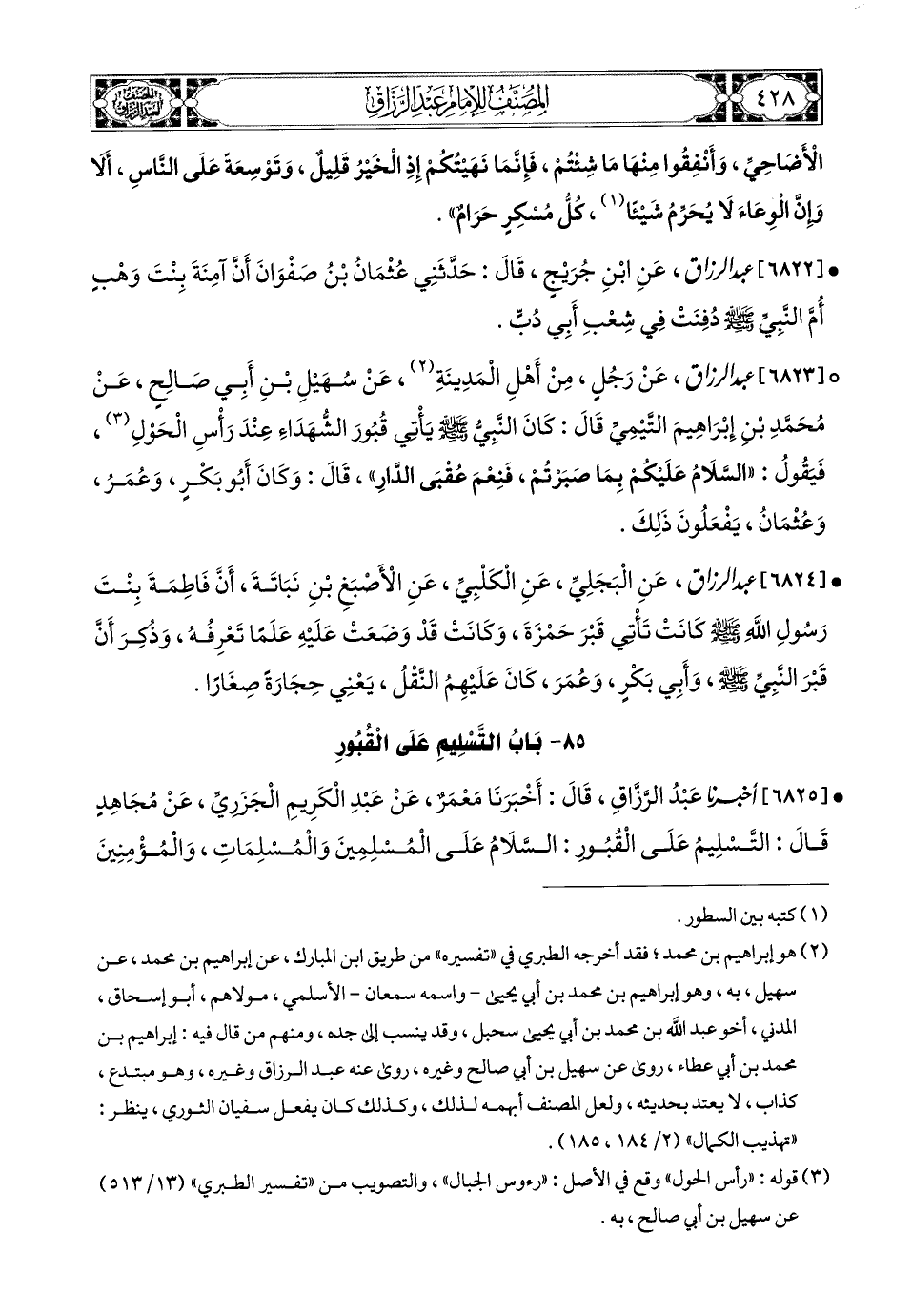 6823- عبد الرزاق، عَن رَجُلٍ مِنْ أَهْلِ المَدِينَةِ، عَن سُهَيْلِ بْنِ أَبِي صَالِحٍ، عَن مُحَمَّدِ بْنِ إِبرَاهِيمَ التَّيْمِيِّ قَالَ: كَانَ النَّبِيُّ صَلَّى اللهُ عَلَيْهِ وَسَلَّمَ يَأْتِي قُبُورَ الشُّهَدَاءِ عِنْدَ رَأْسِ الْحَوْلِ، فَيَقُولُ: السَّلاَمُ عَلَيْكُمْ بِمَا صَبَرْتُمْ، فَنِعْمَ عُقْبَى الدَّارِ.