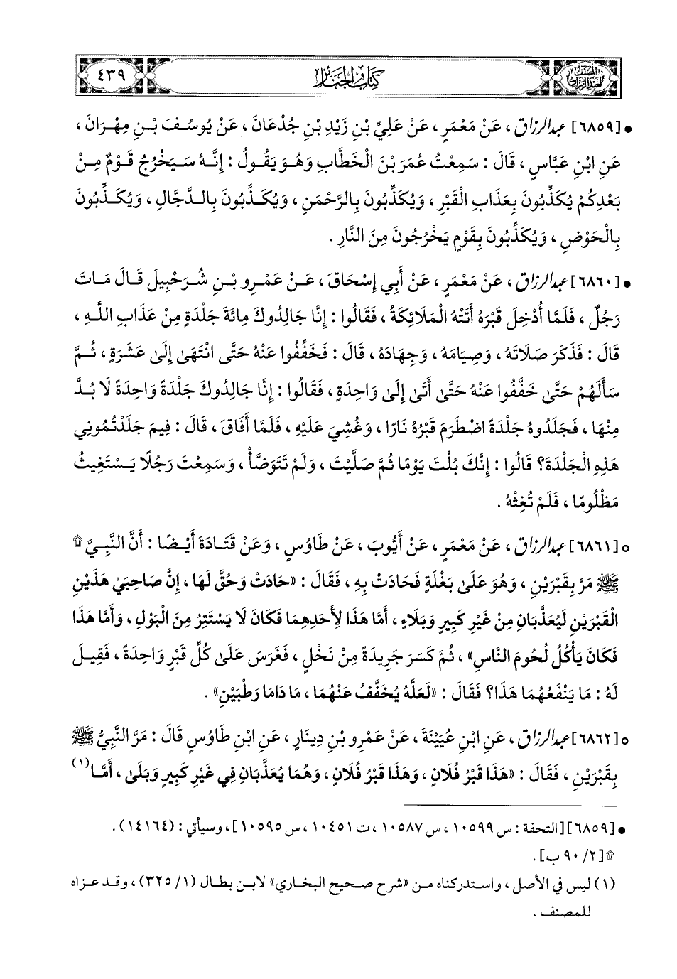 6861 - عبد الرزاق، عَنْ مَعْمَرٍ، عَنْ أَيُّوبَ (1)، عَن طَاوُوسٍ، وَعَنْ قَتَادَةَ أَيْضًا، أَنَّ النَّبِيَّ صَلَّى اللهُ عَلَيْهِ وَسَلَّمَ مَرَّ بِقَبْرَيْنِ وَهُوَ عَلَى بَغْلَةٍ، فَحَادَتْ بِهِ، فَقَالَ: حَادَتْ وَحُقَّ لَهَا، إِنَّ صَاحِبَيْ هَذَيْنِ الْقَبْرَيْنِ ليُعَذَّبَانِ (2) مِنْ غَيْرِ كَبِيرٍ وَبَلاَءٍ، أَمَّا هَذَا لأَحَدِهِمَا، فَكَانَ لاَ يَسْتَتِرُ مِنَ الْبَوْلِ، وَأَمَّا هَذَا فَكَانَ يَأْكُلُ لُحُومَ النَّاسِ، ثُمَّ كَسَرَ جَرِيدَةً مِنْ نَخْلٍ، فَغَرَسَ عَلَى كُلِّ قَبْرٍ وَاحِدَةً، فَقِيلَ لَهُ: مَا يَنْفَعُهُمَا هَذَا؟ فَقَالَ: لَعَلَّهُ يُخَفَّفُ عَنْهُمَا مَا دَامَا رَطْبَينِ (3).