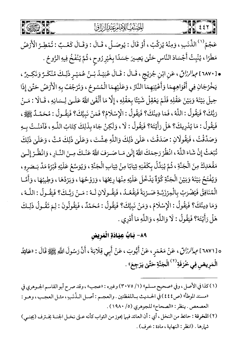 6871- عبد الرزاق، عَنْ مَعْمَرٍ، عَنْ أَيُّوبَ، عَنْ أَبِي قِلاَبَةَ، أَنَّ رَسُولَ اللهِ صَلَّى اللهُ عَلَيْهِ وَسَلَّمَ قَالَ: عَائِدُ الْمَرِيض فِي خُرْفَةِ الْجَنَّةِ حَتَّى يَرْجِعَ.