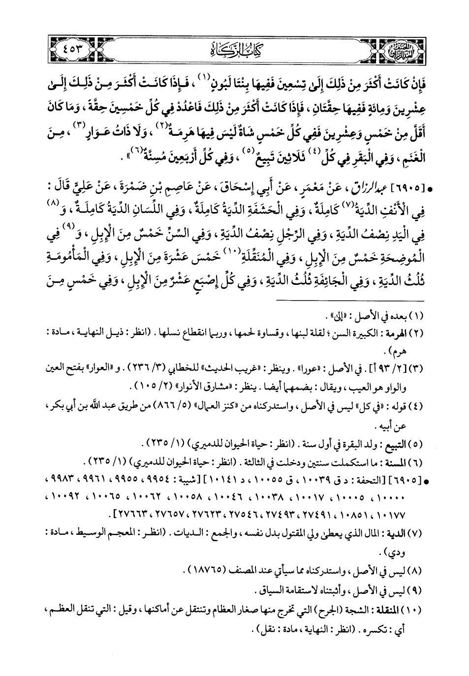6905- عبد الرزاق، عَنْ مَعْمَرٍ، عَنْ أَبِي إِسْحَاقَ، عَنْ عَاصِمِ بْنِ ضَمْرَةَ، عَنْ عَلِيٍّ، قَالَ: فِي الأَنْفِ الدِّيَةُ كَامِلَةٌ، وَفِي الْحَشَفَةِ الدِّيَةُ كَامِلَةٌ، وَفِي اللَّسَانِ الدِّيَةُ كَامِلَةٌ، وَفِي الْيَدِ نِصْفُ الدِّيَةِ، وَفِي الرِّجْلِ نِصْفُ الدِّيَةِ، وَفِي السِّنِّ خَمْسٌ مِنَ الإِبِلِ، وَفِي المُوضِحَةِ خَمْسٌ مِنَ الإِبِلِ، وَفِي المُنْقَلَةِ خَمْسَ عَشْرَةَ مِنَ الإِبِلِ، وَفِي المَأْمُومَةِ ثُلُثُ الدِّيَةِ، وَفِي الْجَائِفَةِ ثُلُثُ الدِّيَةِ، وَفِي كُلِّ إِصْبَعٍ عَشْرٌ مِنَ الإِبِلِ، وَفِي خَمْسٍ مِنَ الإِبِلِ شَاةٌ، وَفِي كُلِّ عَشْرٍ شَاتَانِ، وَفِي خَمْسَ عَشْرَةَ ثَلاَثُ شِيَاهٍ، وَفِي كُلِّ عِشْرِينَ أَرْبَعُ شِيَاهٍ، وَفِي خَمْسٍ وَعِشْرِينَ خَمْسُ شِيَاهٍ، وَفِي سِتٍّ وَعِشْرِينَ بِنْتُ مَخَاضٍ، فَإِنْ لَمْ تَكُنْ بِنْتُ مَخَاضْ فَابْنُ لَبُونٍ ذَكَرٍ، حَتَّى تَبْلُغَ خَمْسًا وَثَلاَثِينَ، فَإِذَا زَادَتْ واحِدَةً فَفِيهَا بِنْتُ لَبُونَ، حَتَّى تَبْلُغَ خَمْسًا وَأَرْبَعِينَ، فَإِذَا زَادَتْ وَاحِدَةً فَفِيهَا حِقَّةٌ طَرُوقَةُ الْفَحْلِ، أَوْ قَالَ: الْجَمَلِ، حَتَّى تَبْلُغَ سِتِّينَ، فَإِذَا زَادَتْ وَاحِدَةً فَفِيهَا جَذَعَةً، حَتَّى تَبْلُغَ خَمْسًا وَسَبْعِينَ،.