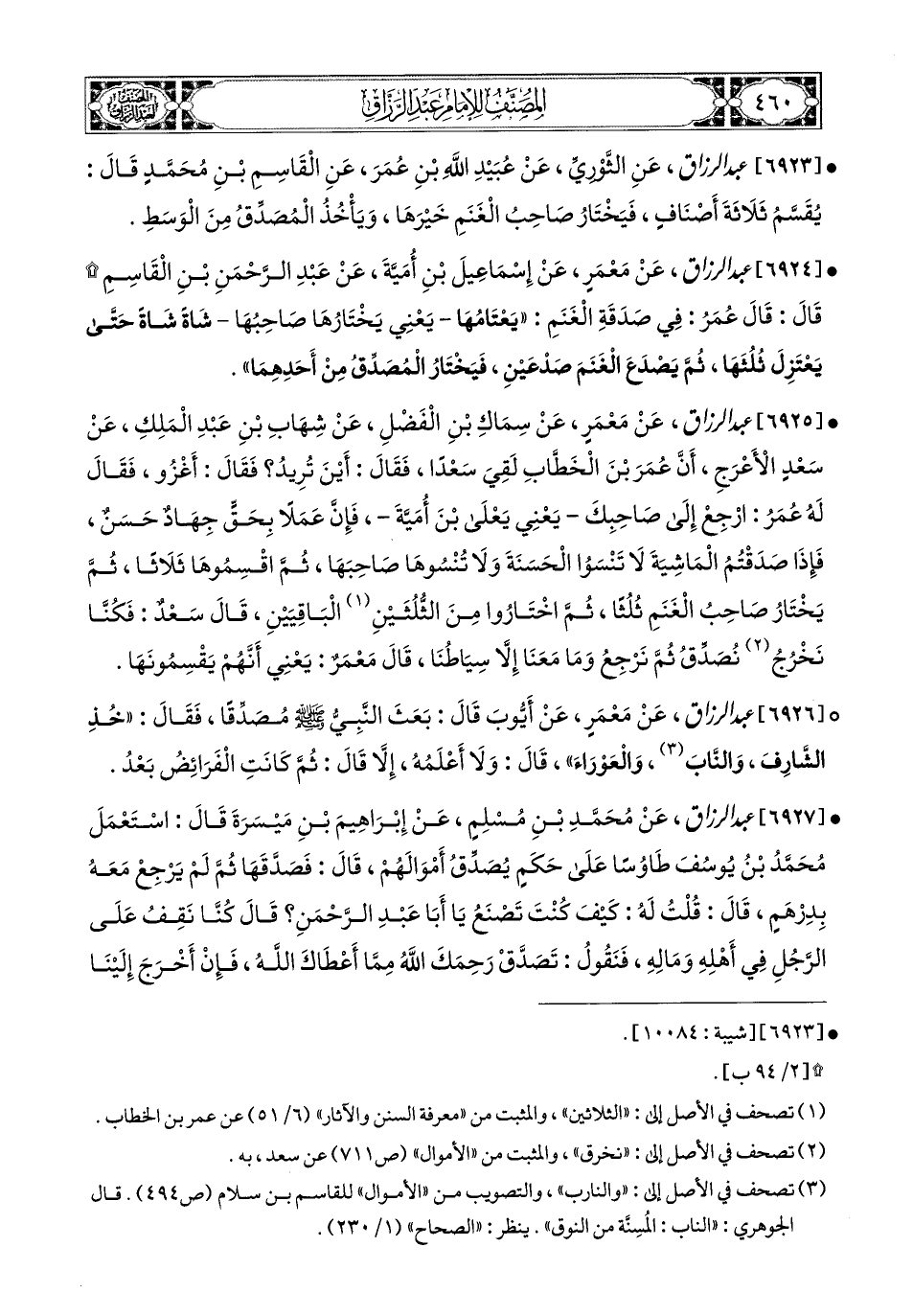 6925- عبد الرزاق، عَنْ مَعْمَرٍ، عَن سِمَاكِ بْنِ الْفَضْلِ، عَن شِهَابِ بْنِ عَبدِ المَلِكِ، عَن سَعْدٍ الأَعْرَجِ، أَنَّ عُمَرَ بْنِ الْخَطَّابِ لَقِيَ سَعْدًا، فَقَالَ: أَيْنَ تُرِيدُ؟ فَقَالَ: أَغْزُو، فَقَالَ لَهُ عُمَرُ: ارْجِعْ إِلَى صَاحِبِكَ، يَعْنِي يَعْلَى بن أُمَيَّةَ، فَإِنَّ عَمَلاً بِحَقٍّ جِهَادٌ حَسَنٌ، فَإِذَا صَدَقْتُمُ المَاشِيَةَ، لاَ تَنْسَوُا الْحَسَنَةَ، وَلاَ تُنْسُوهَا صَاحِبَهَا، ثُمَّ اقْسِمُوهَا ثَلاَثًا، ثُمَّ يَخْتَارُ صَاحِبُ الْغَنَمِ ثُلُثًا، ثُمَّ اخْتَارُوا مِنَ الثُلُثَيْنِ الْبَاقِيَيْنِ، قَالَ سَعْدٌ: فَكُنَّا نَخْرُجُ نُصْدِقُ ثُمَّ نَرْجِعُ، وَمَا مَعَنَا إِلاَّ سِيَاطُنَا.