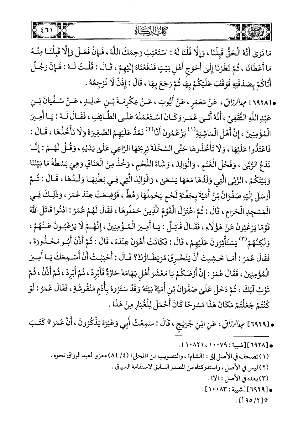 6928- عبد الرزاق، عَنْ مَعْمَرٍ، عَنْ أَيُّوبَ، عَنْ عِكْرِمَةَ بْنِ خَالِدٍ، عَن سُفْيَانَ بْنِ عَبدِ اللهِ الثَّقَفيِّ، أَنَّهُ أَتَى عُمَرَ، وَكَانَ اسْتَعْمَلَهُ عَلَى الطَّائِفِ، فَقَالَ لَهُ: يَا أَمِيرَ المُؤْمِنِينَ، إنَّ أَهْلَ المَاشِيَةِ يَزْعُمُونَ أَنَّا نَعُدُّ عَلَيْهِمُ الصَّغِيرَةَ، وَلاَ نَأْخْذُهَا، قَالَ: فَاعْتَدُّوا عَلَيْها، وَلاَ تَأْخُذُوهَا، حَتَّى السَّخْلَةِ يُرِيحُهَا الرَّاعِي عَلَى يَدَيْهِ، وَقُلْ لَهُمْ: إِنَّا نَدَعُ الرُّبَّى، وَفَحْلَ الْغَنَمِ، وَالْوَالِدَ، وَشَاةَ اللَّحْمِ، وَخُذْ مِنَ الْعَنَاقِ، وَهِيَ بَسْطَةُ مَا بَيْنَنَا وَبَيْنَكُمُ، الرُّبَّى الَّتِي وَلَدُهَا مَعَهَا يَسْعَى، وَالْوَالِدَ الَّتِي فِي بَطْنِهَا وَلَدُهَا، قَالَ: ثُمَّ أَرْسَلَ إِلَيْهِ صَفْوَانُ بن أُمَيَّةَ بِجَفْنَةِ لَحْمٍ يَحْمِلُهَا رَهْطٌ، فَوُضِعَتْ عِنْدَ عُمَرَ، وَذَلِكَ فِي المَسْجِدِ الْحَرَامِ، قَالَ: ثُمَّ اعْتَزَلَ الْقَوْمُ الَّذِينَ حَمَلُوهَا، فَقَالَ لَهُمْ عُمَرُ: ادْنُوا قَاتَلَ اللهَ قَوْمًا يَرْغَبُونَ عَن هَؤُلاَءِ، فَقَالَ قَائِلٌ: يَا أَمِيرَ المُؤْمِنِينَ، إِنَّهُمْ لاَ يَرْغَبُونَ عَنْهُمْ، وَلَكِنَّهُمْ يَسْتَأْثِرُونَ عَلَيْهِمْ، قَالَ: فَكَانَتْ أَهْوَنَ عِنْدَهُ، قَالَ: ثُمَّ أَذَّنَ أَبو مَحْذُورَةَ، فَقَالَ عُمَرُ: أَمَا خَشِيتَ أَنْ يَنْخَرِقَ مُرَيَطَاؤُكَ؟ قَالَ: أَحْبَبْتُ أَنْ أُسْمِعَكَ يَا أَمِيرَ المُؤْمِنِينَ، فَقَالَ عُمَرُ: إنَّ أَرْضَكُمْ يَا مَعْشَرَ أَهْلِ تِهَامَةَ حَارَّةٌ، فَأَبْرِدْ ثُمَّ أَبْرِدْ، ثُمَّ أَذِّنْ، ثُمَّ ثَوِّبْ آتِكَ، ثُمَّ دَخَلَ عَلَى صَفْوَانَ بْنِ أُمَيَّةَ بَيْتَهُ، وَقَدْ سَتَرُوهُ بِأُدْمٍ مَنْقُوشَةٍ، فَقَالَ عُمَرُ: لَوْ كُنْتُمْ جَعَلْتَمْ مَكَانَ هَذَا مَسُوحًا كَانَ أَحْمَلَ لِلْغُبَارِ مِنْ هَذَا.