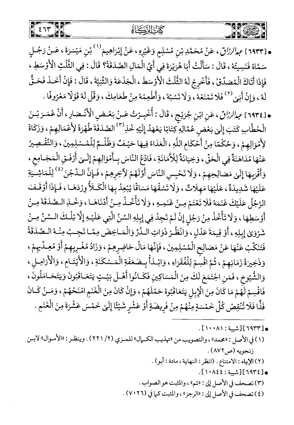 6934- عبد الرزاق، عَنِ ابْنِ جُرَيْجٍ، قَالَ: أُخْبِرْتُ عَن بَعْضِ الأَنْصَارِ، أَنَّ عُمَرَ بن الْخَطَّابِ كَتَبَ إِلَى بَعْضِ عُمَّالِهِ كِتَابًا يَعْهَدُ إِلَيْهِ: خُذِ الصَّدَقَةَ مِنَ المُسْلِمِينَ طُهْرَةً لأَعْمَالِهِمْ، وَزَكَاةً لأَمْوَالِهِمْ، وَحُكْمًا مِنْ أَحْكَامِ اللهِ، الْعَدَاءُ فِيهَا حَيْفٌ، وَظُلْمٌ لِلْمُسْلِمِينَ، وَالتَّقْصِيرُ عَنْهَا مُدَاهَنَةٌ فِي الْحَقِّ، وَخِيَانَةٌ لِلأَمَانَةِ، فَادْعُ النَّاسَ بِأَمْوَالِهِمْ إِلَى أَرْفَقِ المَجَامِعِ، وَأَقْرَبِهَا إِلَى مَصَالِحِهِمْ، وَلاَ تَحْبِسِ النَّاسَ أَوَّلَهُمْ لآخِرِهِمْ، فَإِنَّ الدَّجن لِلْمَاشَيَةِ عَلَيْهَا شَدِيدة عليهَا مَهيلات، وَلاَ تَسُقْهَا مَسَاقًا يُبْعِدُ بِهَا الْكَلأُ وِرْدَهَا، فَإِذَا أَوْقَفَ الرَّجُلُ عَلَيْكَ غَنَمَهُ، فَلاَ تَعْتَمْ مِنْ غَنَمِهِ، وَلاَ تَأْخُذْ مِنْ أَدْنَاهَا، وَخُذِ الصَّدَقَةَ مِنْ أَوْسَطِهَا، وَلاَ تَأْخُذْ مِنْ رَجُلٍ إنْ لَمْ تَجِدْ فِي إِبِلِهِ السِّنَّ الَّتِي عَلَيْهِ إِلاَّ تِلْكَ السِّنَّ مِنْ شَرْوَى إِبِلِهِ، أَوْ قِيمَةَ عَدْلٍ، وَانْظُرْ ذَواتِ الدَّرِّ، وَالمَاخِضَ مِمَّا تَجِبُ مِنْهُ الصَّدَقَةُ فَتَنَكَّبْ عَنْهَا عَنْ مَصَالِحِ المُسْلِمِينَ، فَإِنَّهَا مَالُ حَاضِرِهِمْ، وَزَادُ مُغْرِبِهَمْ، أَوْ مُعِدِّيهِمْ، وَذَخِيرَةُ زَمَانِهِمْ، ثُمَّ اقْسِمْ لِلْفُقَرَاءِ، وَابْدَأْ بِضَعَفَةِ المَسْكَنَةِ، وَالأَيْتَامِ، وَالأَرَامِلِ، وَالشُّيُوخِ، فَمَنِ اجْتَمَعَ لَكَ مِنَ المَسَاكِينِ فَكَانُوا أَهْلَ بَيْتٍ يَتَعَاقَبُونَ، وَيَتَحَامَلُونَ، فَاقْسِمْ لَهُمْ مَا كَانَ مِنَ الإِبِلِ يَتَعَاقَبُوهُ حَمْلَهُمْ، وَإِنْ كَانَ مِنَ الْغَنَمِ امْنَحْهُمْ، وَمَنْ كَانَ فَذًّا فَلاَ تُنْقِصْ كُلَّ خَمْسَةٍ مِنْهُمْ مِنْ فَرَيْضَةٍ، أَوْ عَشْرٍ شَيْئًا إِلَى خَمْسَ عَشْرَةَ مِنَ الْغَنَمِ.