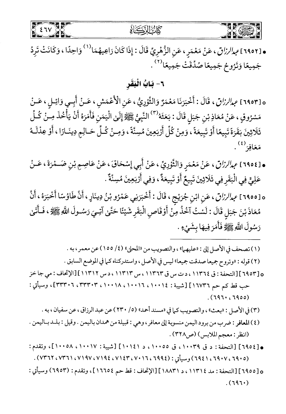 6953- أخبرنا عبد الرزاق، قَالَ: أَخْبَرَنَا مَعْمَرٌ، وَالثَّورِيُّ، عَنِ الأَعمَشِ، عَنْ أَبِي وَائِلٍ، عَنْ مَسْرُوقٍ، عَن مُعَاذَ بْنِ جَبَلٍ قَالَ: بَعَثَهُ النَّبِيُّ صَلَّى اللهُ عَلَيْهِ وَسَلَّمَ إِلَى الْيَمَنِ، فَأَمَرَهُ أَنْ يَأْخُذَ مِنْ كُلِّ ثَلاَثِينَ بَقَرَةً تَبِيعًا، أَوْ تَبِيعَةً، وَمِنْ كُلِّ أَرْبَعِينَ مُسِنَّةً، وَمِنْ كُلِّ حَالِمْ دِينَارًا، أَوْ عَدْلَهُ مَعَافِرَ.