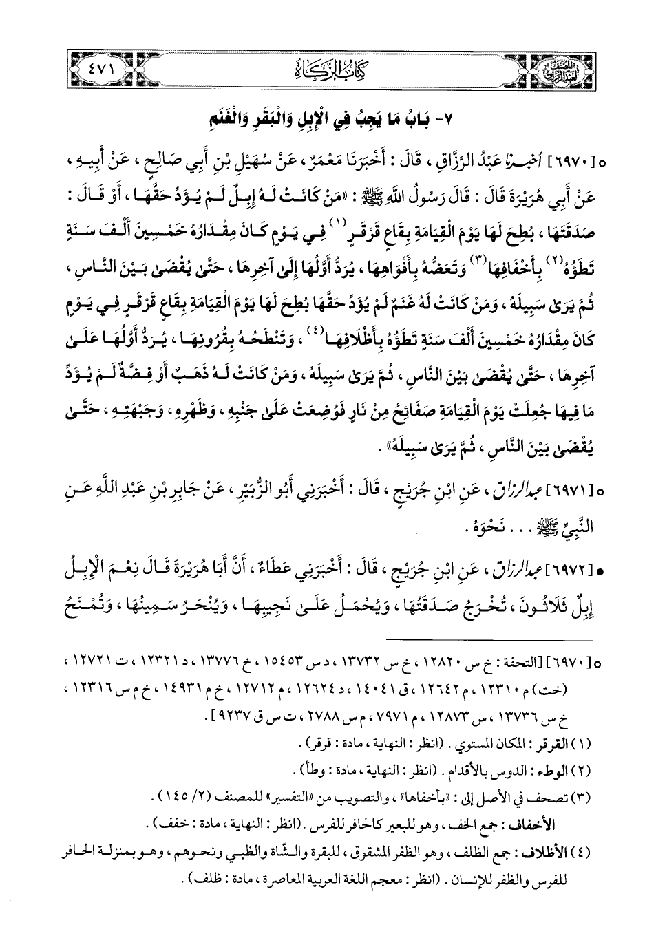 6970- أخبرنا عبد الرزاق، قَالَ: أَخْبَرَنَا مَعْمَرٌ، عَن سُهَيْلِ بْنِ أَبِي صَالِحٍ، عَنْ أَبِيهِ، عَنْ أَبِي هُرَيرَةَ، قَالَ: قَالَ رَسُولُ اللهِ صَلَّى اللهُ عَلَيْهِ وَسَلَّمَ: مَنْ كَانَتْ لَهُ إِبِلٌ لَمْ يُؤَدِّ حَقَّهَا، أَوْ قَالَ: صَدَقَتَهَا، بُطِحَ لَهَا يَوْمَ الْقِيَامَةِ بِقَاعٍ قَرْقَرٍ، فِي يَوْمٍ كَانَ مِقْدَارُهُ خَمْسِينَ أَلْفَ سَنَةٍ، تَطَؤُهُ بِأَخْفَافِهَا وَتَعَضُّهُ بِأَفْوَاهِهَا، يُرَدُّ أَوَّلُهَا إِلَى آخِرِهَا، حَتَّى يُقْضَى بَيْنَ النَّاسِ، ثُمَّ يَرَى سَبِيلَهُ، وَمَنْ كَانَتْ لَهُ غَنَمٌ لَمْ يُؤَدِّ حَقَّهَا، بُطِحَ لَهَا يَوْمَ الْقِيَامَةِ بِقَاعٍ قَرْقَرٍ، فِي يَوْمٍ كَانَ مِقْدَارُهُ خَمْسِينَ أَلْفَ سَنَةٍ، تَطَؤُهُ بِأَظْلاَفِهَا، وَتَنْطَحُهُ بِقُرُونِهَا، يُرَدُّ أَوَّلُهَا عَلَى آخِرِهَا، حَتَّى يُقْضَى بَيْنَ النَّاسِ، ثُمَّ يَرَى سَبِيلَهُ، وَمَنْ كَانَتْ لَهُ ذَهَبٌ أَوْ فِضَّةٌ، لَمْ يُؤَدِّ ما فِيهَا، جُعِلَتْ يَوْمَ الْقِيَامَةِ صَفَائِحَ مِنْ نَارٍ، فَوُضِعَتْ عَلَى جَنْبِهِ، وَظَهْرِهِ، وَجَبْهَتِهِ، حَتَّى يُقْضَى بَيْنَ النَّاسِ، ثُمَّ يَرَى سَبِيلَهُ.