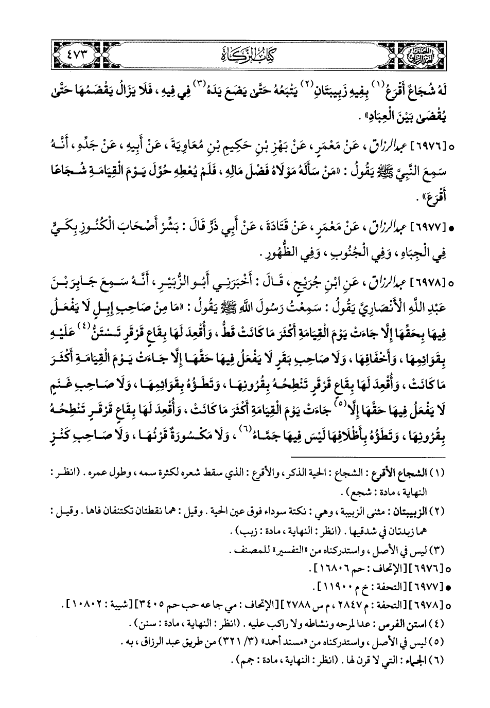 6978- عبد الرزاق، عَنِ ابْنِ جُرَيْجٍ، قَالَ: أَخْبَرَنِي أَبو الزُّبَيْرِ، أَنَّهُ سَمِعَ جَابِرَ بن عَبدِ اللهِ الأَنْصَارِيَّ يَقُولُ: سَمِعْتُ رَسُولَ اللهِ صَلَّى اللهُ عَلَيْهِ وَسَلَّمَ يَقُولُ: مَا مِنْ صَاحِبِ إِبِلٍ لاَ يَفْعَلُ فِيهَا بِحَقِّهَا، إِلاَّ جَاءَتْ يَوْمَ الْقِيَامَةِ أَكْثَرَ مَا كَانَتْ قَطُّ، وَأُقْعِدَ لَهَا بِقَاعٍ قَرْقَرٍ، تَسْتَنُّ عَلَيْه بِقَوَائِمِهَا وَأَخْفَافِهَا، وَلاَ صَاحِبَ بَقَرٍ لاَ يَفْعِلُ فِيهَا حَقَّهَا، إِلاَّ جَاءَتْ يَوْمَ الْقِيَامَةِ أَكْثَرَ مَا كَانَتْ، وَأُقْعِدَ لَهَا بِقَاعٍ قَرْقَرٍ، تَنْطَحُهُ بِقُرُونِهَا، وَتَطَؤُهُ بِقَوَائِمِهَا، وَلاَ صَاحِبَ غَنَمٍ لاَ يَفْعَلُ فِيهَا حَقَّهَا، إِلاَّ جَاءَتْ يَوْمَ الْقِيَامَةِ أَكْثَرَ مَا كَانَتْ، وَأُقْعِدَ لَهَا بِقَاعٍ قَرْقَرٍ تَنْطَحُهُ بِقُرُونِهَا، وَتَطَؤُهُ بِأَظْلاَفِهَا، لَيْسَ فِيهَا جَمَّاءُ، وَلاَ مَكْسُورَةٌ قَرْنُهَا، وَلاَ صَاحِبِ كَنْزٍ لاَ يَفْعَلُ فِيهِ حَقَّهُ، إِلاَّ جَاءَ كَنْزُهُ يَوْمَ الْقِيَامَةِ شُجَاعًا أَقْرَعَ، يَتْبَعُهُ فَاتِحًا فَاهُ، فَإِذَا أَتَاهُ فَرَّ مِنْهُ فَيُنَادِيَهُ، خُذْ كَنْزَكَ الَّذِي خَبَّأْتَهُ، فَأَنَا عَنْهُ غَنِيٌّ، فَإِذَا رَأَى أَنْ لاَ بُدَّ مِنْهُ، سَلَكَ يَدَهُ فِي فِيهِ فَيَقْضِمَهَا قَضْمَ الْفَحْلِ.