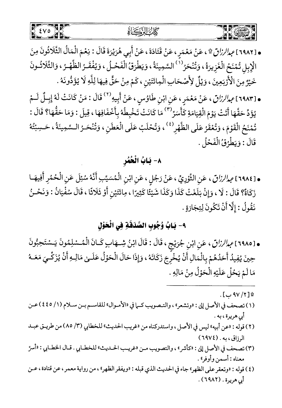 6982- عبد الرزاق، عَنْ مَعْمَرٍ، عَن قَتَادَةَ، عَنْ أَبِي هُرَيرَةَ، قَالَ: نِعْمَ المَالُ الثَّلاَثُونَ مِنَ الإِبِلِ، تُمْنَحُ الْغَزِيرَةُ، وَتُنْحَرُ السَّمِينَةُ، وَيَطْرُقُ الْفَحْلُ، وَيَفْقُرُ الظَّهْرُ، وَالثَّلاَثُونَ خَيْرٌ مِنَ الأَرْبَعِينَ، وَيْلٌ لأَصْحَابِ المِئَتَيْنِ، كَمْ مِنْ حق فِيها لله لاَ يُؤَدُّونَهُ.