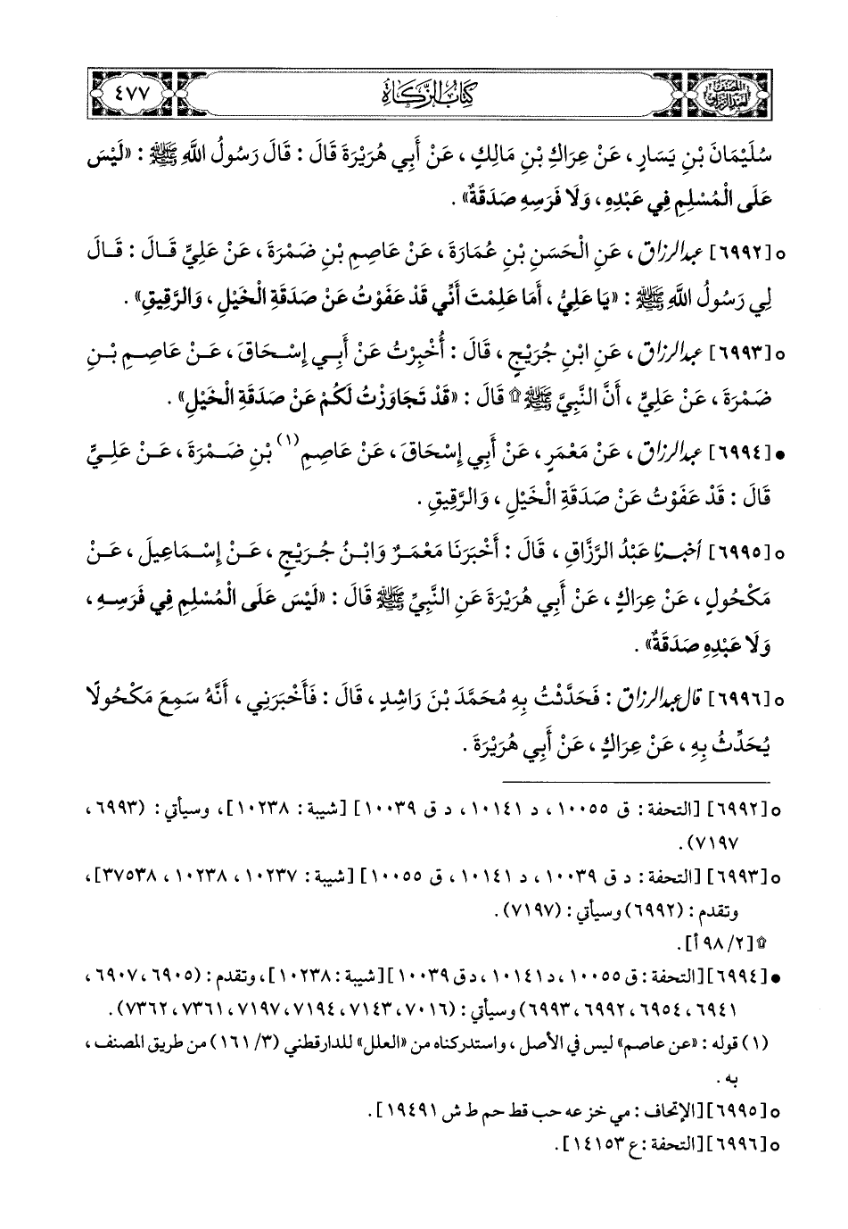 6995- أخبرنا عبد الرزاق، قَالَ: أَخْبَرَنَا مَعْمَرٌ، وَابْنُ جُرَيْجٍ، عَنِ إِسْمَاعِيلَ، عَنْ مَكْحُولٍ، عَنْ عِرَاكٍ، عَنْ أَبِي هُرَيرَةَ، عَنِ النَّبِيِّ صَلَّى اللهُ عَلَيْهِ وَسَلَّمَ قَالَ: لَيْسَ عَلَى المُسْلِمِ فِي فَرَسِهِ، وَلاَ عَبدِهِ صَدَقَةٌ.