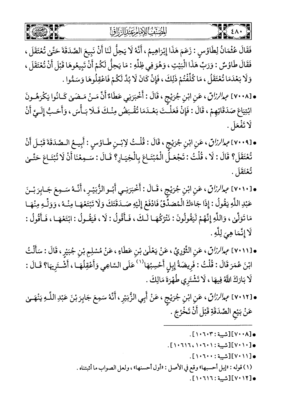 7009- عبد الرزاق، عَنِ ابْنِ جُرَيْجٍ، قَالَ: قُلْتُ لاِبْنِ طَاوُوسٍ: أَبِيعُ الصَّدَقَةَ قَبْلَ أَنْ تُعْتَقَلَ؟ قَالَ: لاَ، قُلْتُ: تَجْعَلُ المُبْتَاعَ بِالْخِيَارِ؟ قَالَ: سَمِعْنَا أَنْ لاَ تُبْتَاعَ حَتَّى تُعْتَقَلَ.