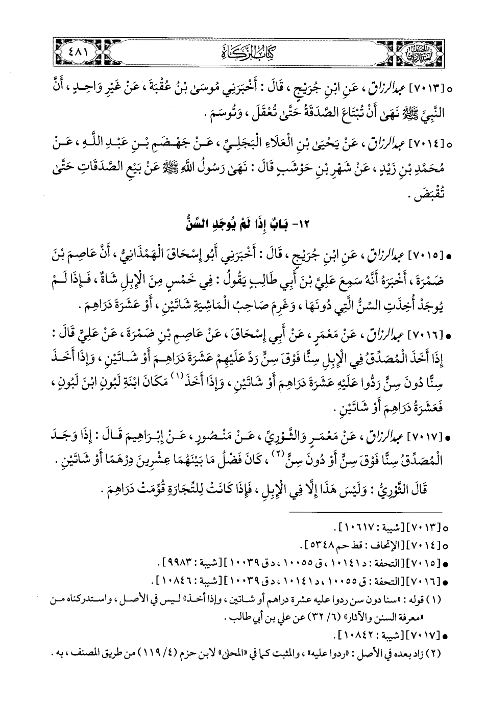 7016- عبد الرزاق، عَنْ مَعْمَرٍ، عَنْ أَبِي إِسْحَاقَ، عَنْ عَاصِمِ بْنٍ ضَمْرَةَ، عَنْ عَلِيٍّ، قَالَ: إِذَا أَخَذَ المُصَدِّقُ فِي الإِبِلِ سِنًّا فَوْقَ سِنٍّ رَدَّ عَلَيْهِمْ عَشَرَةَ دَرَاهِمَ، أَوْ شَاتَيْنِ، وَإِذَا أَخَذَ سِنًّا دُونَ سِنٍّ رَدُّوا عَلَيْهِ عَشَرَةَ دَرَاهِمَ أَوْ شَاتَيْنِ، وَإِذَا أَخَذَ مَكَانَ ابْنَةَ لَبُونَ ابْنَ لَبُونَ، فَعَشَرَةَ دَرَاهِمَ، أَوْ شَاتَيْنِ.