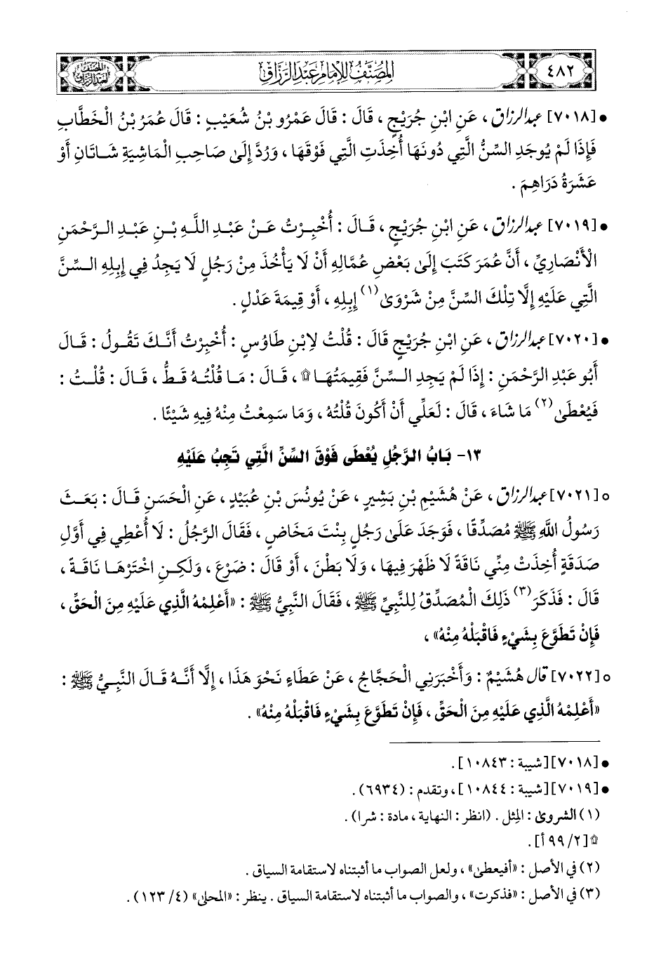 7018- عبد الرزاق، عَنِ ابْنِ جُرَيْجٍ، قَالَ: قَالَ عَمْرُو بن شُعَيْبٍ: قَالَ عُمَرُ بن الْخَطَّابِ: فَإِذَا لَمْ يوجَدِ السِّنُّ الَّتِي دُونَهَا أُخِذَتِ الَّتِي فَوْقَهَا، وَرُدَّ إِلَى صَاحِبِ المَاشِيَةِ شَاتَانِ، أَوْ عَشَرَةُ دَرَاهِمَ.