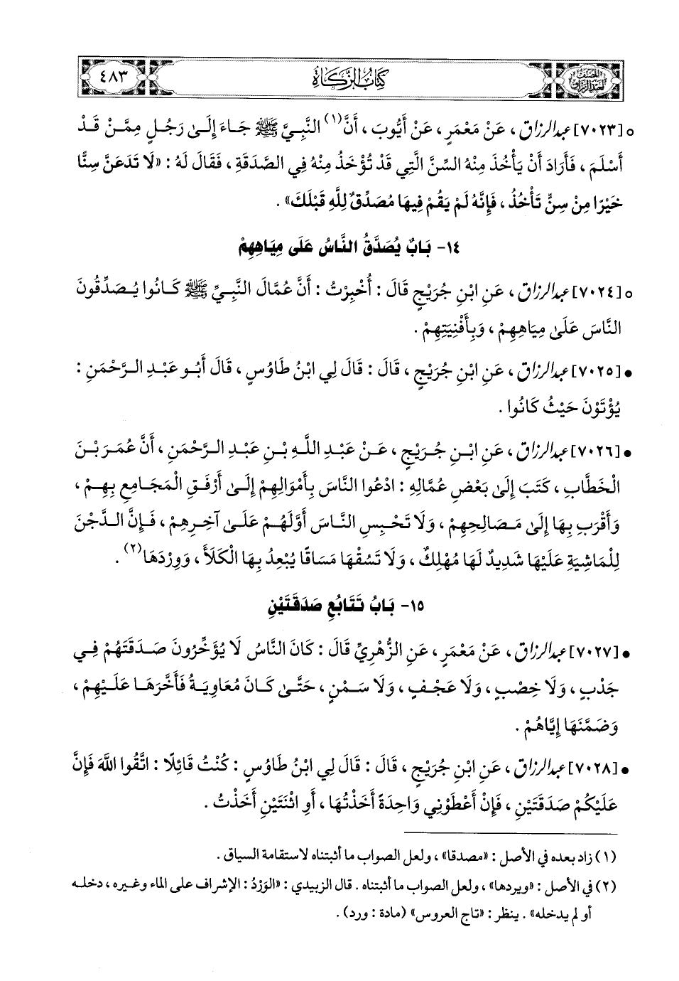 7024- عبد الرزاق، عَنِ ابْنِ جُرَيْجٍ، قَالَ: أُخْبِرْتُ أَنَّ عُمَّالَ النَّبِيِّ صَلَّى اللهُ عَلَيْهِ وَسَلَّمَ كَانُوا يُصْدِقُونَ النَّاسَ عَلَى مِيَاهِهِمْ، وَبَأَفْنِيَتِهِمْ.