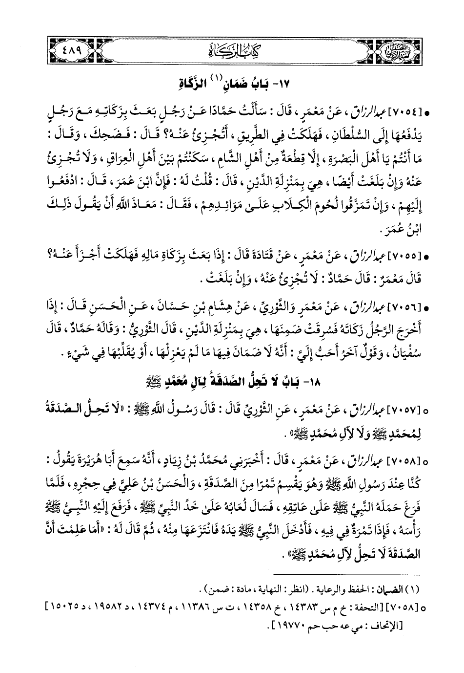 7057- عبد الرزاق، عَنْ مَعْمَرٍ، عَنِ الثَّورِيِّ قَالَ: قَالَ رَسُولُ اللهِ صَلَّى اللهُ عَلَيْهِ وَسَلَّمَ: لاَ تَحِلُّ الصَّدَقَةُ لِمُحَمَّدٍ صَلَّى اللهُ عَلَيْهِ وَسَلَّمَ، وَلاَ لآلِ مُحَمَّدٍ صَلَّى اللهُ عَلَيْهِ وَسَلَّمَ.