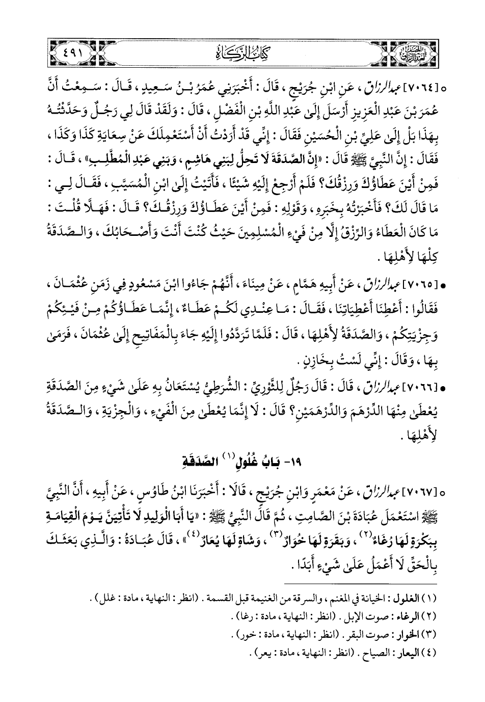 7067- عبد الرزاق، عَنْ مَعْمَرٍ، وَابْنِ جُرَيْجٍ، قَالاَ: أَخْبَرَنَا ابْنُ طَاوُوسٍ، عَنْ أَبِيهِ، أَنَّ النَّبِيَّ صَلَّى اللهُ عَلَيْهِ وَسَلَّمَ اسْتَعْمَلَ عُبَادَةَ بن الصَّامِتِ، ثُمَّ قَالَ النَّبِيُّ صَلَّى اللهُ عَلَيْهِ وَسَلَّمَ: يَا أَبَا الْوَلِيدِ، لاَ تَأْتِينَّ يَوْمَ الْقِيَامَةِ بِبَكْرَةٍ لَهَا رُغَاءٌ، وَبَقَرَةٍ لَهَا خُوَارٌ، وَشَاةٍ لَهَا يُعَارٌ، قَالَ عُبَادَةُ: وَالَّذِي بَعَثَكَ بِالْحَقِّ لاَ أَعْمَلُ عَلَى شَيْءٍ أَبَدًا.