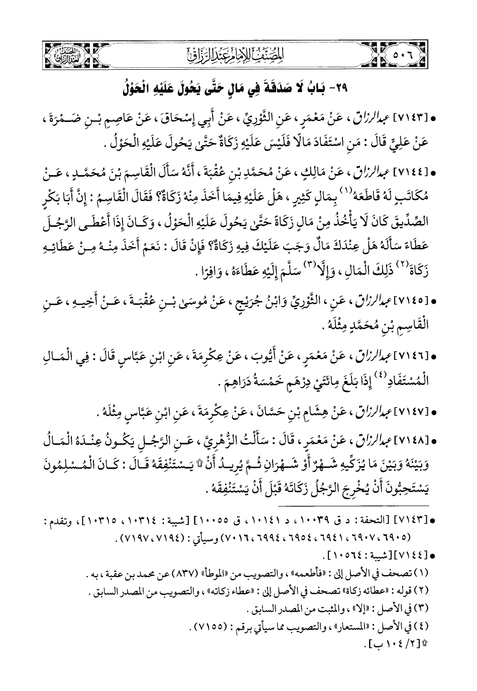 7144- عبد الرزاق، عَنْ مَالِكٍ، عَن مُحَمَّدِ بْنِ عُقْبَةَ، أَنَّهُ سَأَلَ الْقَاسِمَ بن مُحَمَّدٍ عَن مُكَاتَبٍ لَهُ قَاطَعَهُ بِمَالٍ كَثِيرٍ، هَلْ عَلَيْهِ فِيمَا أَخَذَ مِنْهُ زَكَاةٌ؟ فَقَالَ الْقَاسِمُ: أَنَّ أَبَا بَكْرٍ الصِّدِّيقَ كَانَ لاَ يَأْخُذُ مِنْ مَالٍ زَكَاةً، حَتَّى يَحُولَ عَلَيْهِ الْحَوْلُ، وَكَانَ إِذَا أَعْطَى الرَّجُلَ عَطَاءً سَأَلَهُ: هَلْ عِنْدَكَ مَالٌ وَجَبَ عَلَيْكَ فِيهِ زَكَاةٌ؟ فَإِنْ قَالَ: نَعَمْ، أَخَذَ مِنْهُ مِنْ عَطَائِهِ زَكَاةَ ذَلِكَ المَالِ، وَإِلاَّ سَلَّمَ إِلَيْهِ عَطَاءَهُ وَافِرًا.