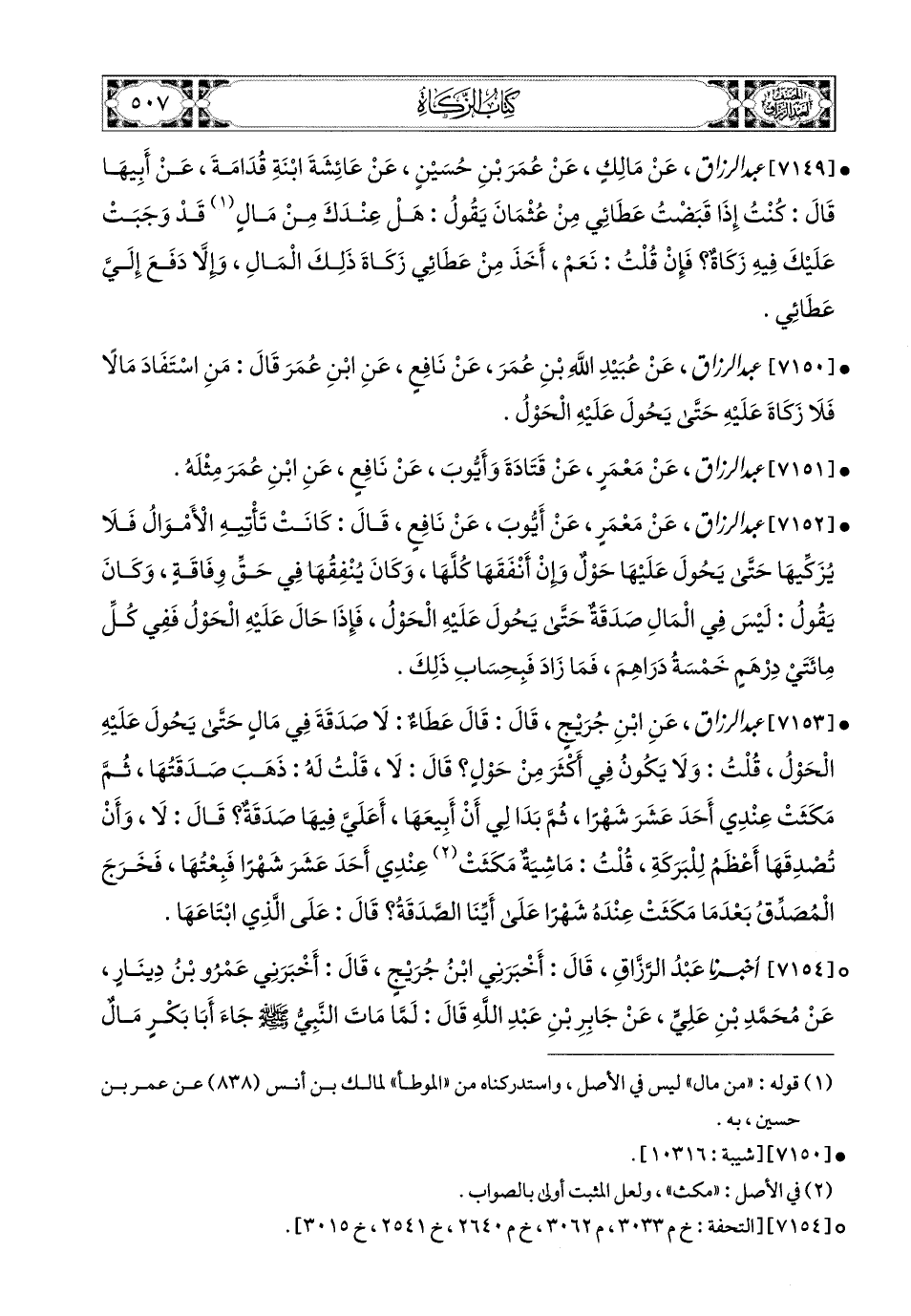 7152- عبد الرزاق، عَنْ مَعْمَرٍ، عَنْ أَيُّوبَ، عَن نَافِعٍ، قَالَ: كَانَتْ تَأْتِيهِ الأَمْوَالُ فَلاَ يُزَكِّيهَا، حَتَّى يَحُولَ عَلَيْهَا حَوْلٌ، وَإِنْ أَنْفَقَهَا كُلَّهَا، وَكَانَ يُنْفِقُهَا فِي حَقِّ وِفَاقَةٍ، وَكَانَ يَقُولُ: لَيْسَ فِي المَالِ صَدَقَةٌ، حَتَّى يَحُولَ عَلَيْهِ الْحَوْلُ، فَإِذَا حَالَ عَلَيْهِ الْحَوْلُ، فَفِي كُلِّ مِئَتَيْ دِرْهَمٍ خَمْسَةُ دَرَاهِمَ، فَمَا زَادَ فَبِحِسَابِ ذَلِكَ.