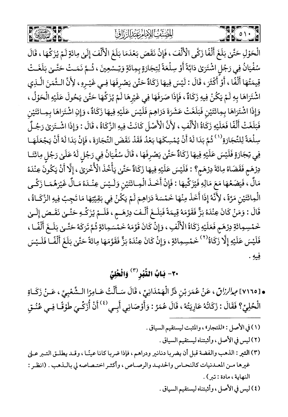 7165- عبد الرزاق، عَن عُمَرَ بْنِ ذَرٍّ الْهَمْدَانِيِّ، قَالَ: سَأَلْتُ عَامِرًا الشَّعْبِيَّ عَن زَكَاةِ الْحُلِيِّ؟ فَقَالَ: زَكَاتُهُ عَارِيَتُهُ، قَالَ عُمَرُ: وَأَوْصَانِي أَبِي أَنْ أُزَكِّيَ طَوْقًا فِي عُنُقِ أُخْتِي، قَالَ أَبِي: وَكَانَ يُقَالُ: إِنَّ الشَّيْءَ المَوْضُوعَ إِذَا زُكِّيَ مَرَّةً، فَإِنَّهُ لاَ يُزَكَّى حَتَّى يُقَلَّبَ فِي شَيْءٍ آخَرَ.