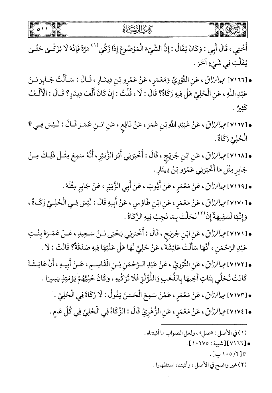 7172- عبد الرزاق، عَنِ الثَّورِيِّ، عَنْ عَبدِ الرَّحْمَنِ بْنِ الْقَاسِمِ، عَنْ أَبِيهِ، أَنَّ عَائِشَةَ كَانَتْ تُحَلِّي بَنَاتِ أَخِيهَا بِالذَّهَبِ وَاللُّؤْلِؤِ فَلاَ تُزَكِّيهِ وَكَانَ حُلِيُّهُمْ يَوْمَئِذٍ يَسِيرًا.