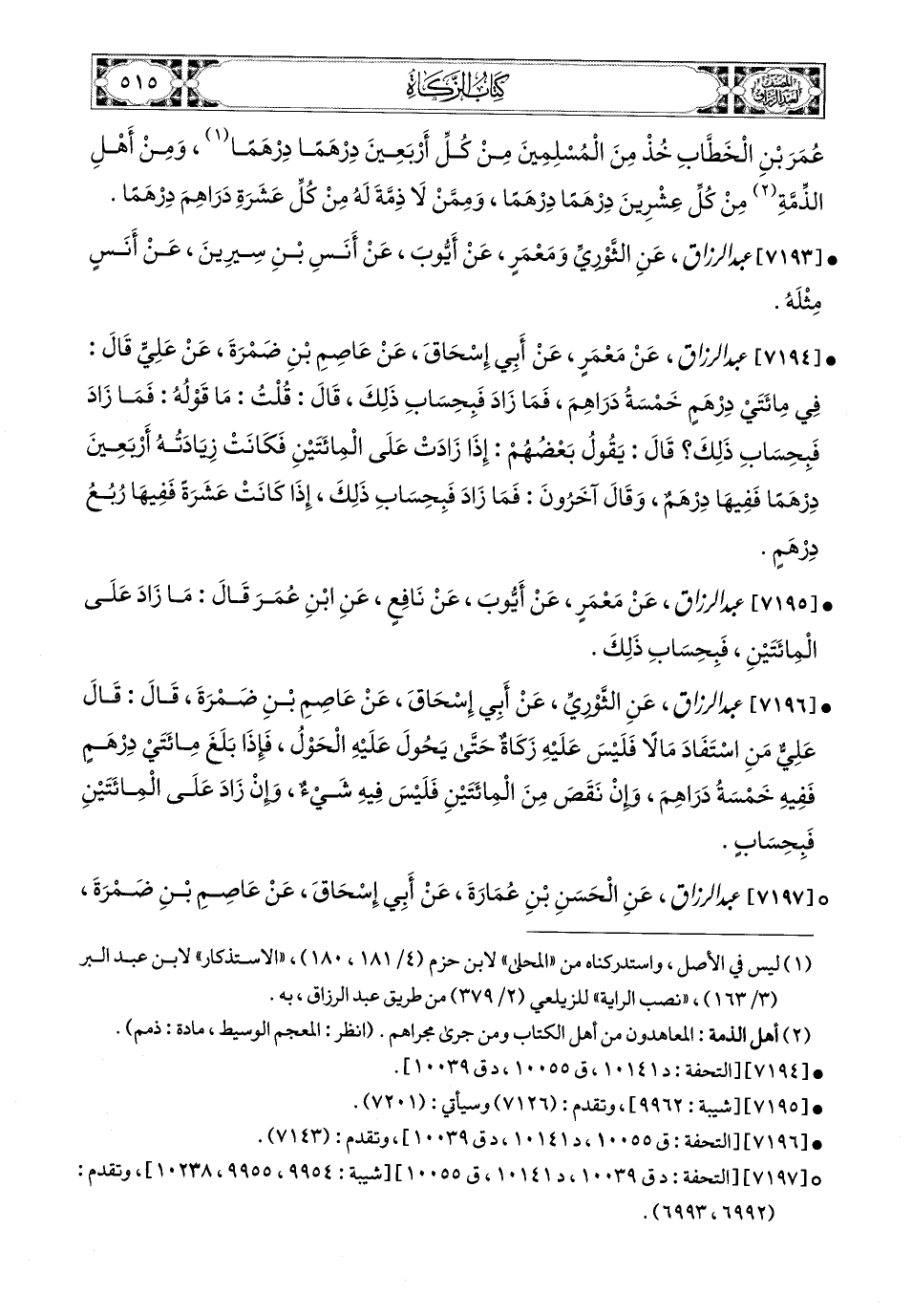7195- عبد الرزاق، عَنْ مَعْمَرٍ، عَنْ أَيُّوبَ، عَن نَافِعٍ، عَنِ ابْنِ عُمَرَ، قَالَ: مَا زَادَ عَلَى المِئَتَيْنِ، فَبِحِسَابِ ذَلِكَ.