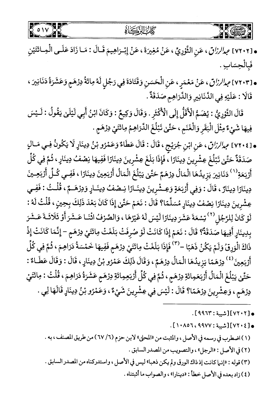 7202- عبد الرزاق، عَنِ الثَّورِيِّ، عَن مُغِيرَةَ، عَن إِبرَاهِيمَ، قَالَ: مَا زَادَ عَلَى المِئَتَيْنِ فَبِالْحِسَابِ.