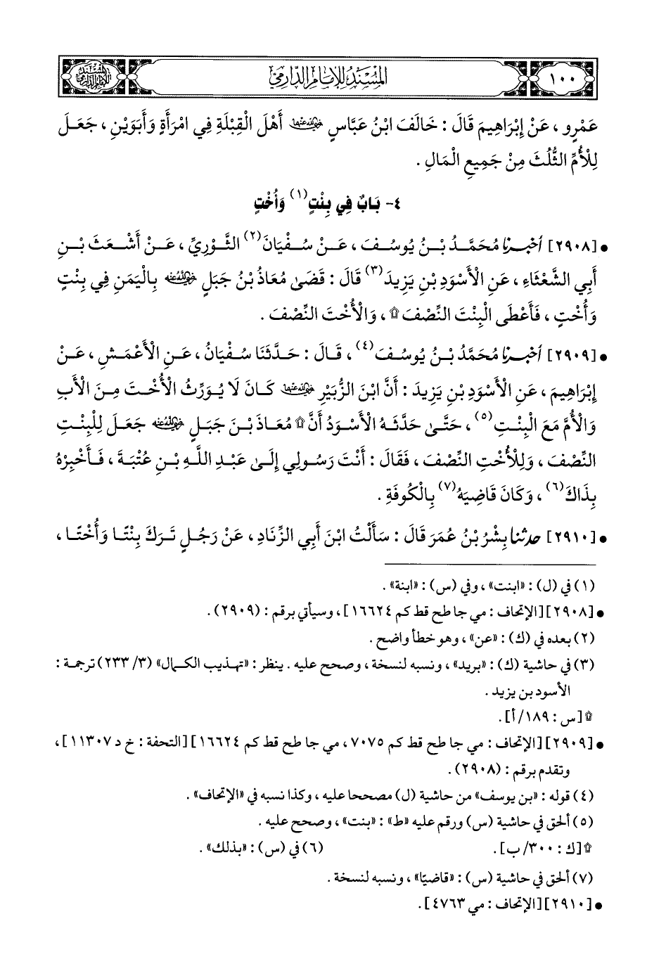2908- أَخبَرَنا مُحَمَّدُ بْنُ يُوسُفَ, عَنْ سُفْيَانَ الثَّوْرِيِّ, عَنْ أَشْعَثَ بْنِ أَبِي الشَّعْثَاءِ, عَنِ الأَسْوَدِ بْنِ يَزِيدَ, قَالَ: قَضَى مُعَاذُ بْنُ جَبَلٍ رَضِيَ اللهُ عَنْهُ بِالْيَمَنِ فِي بِنْتٍ وَأُخْتٍ, فَأَعْطَى الْبِنْتَ النِّصْفَ, وَالأُخْتَ النِّصْفَ.