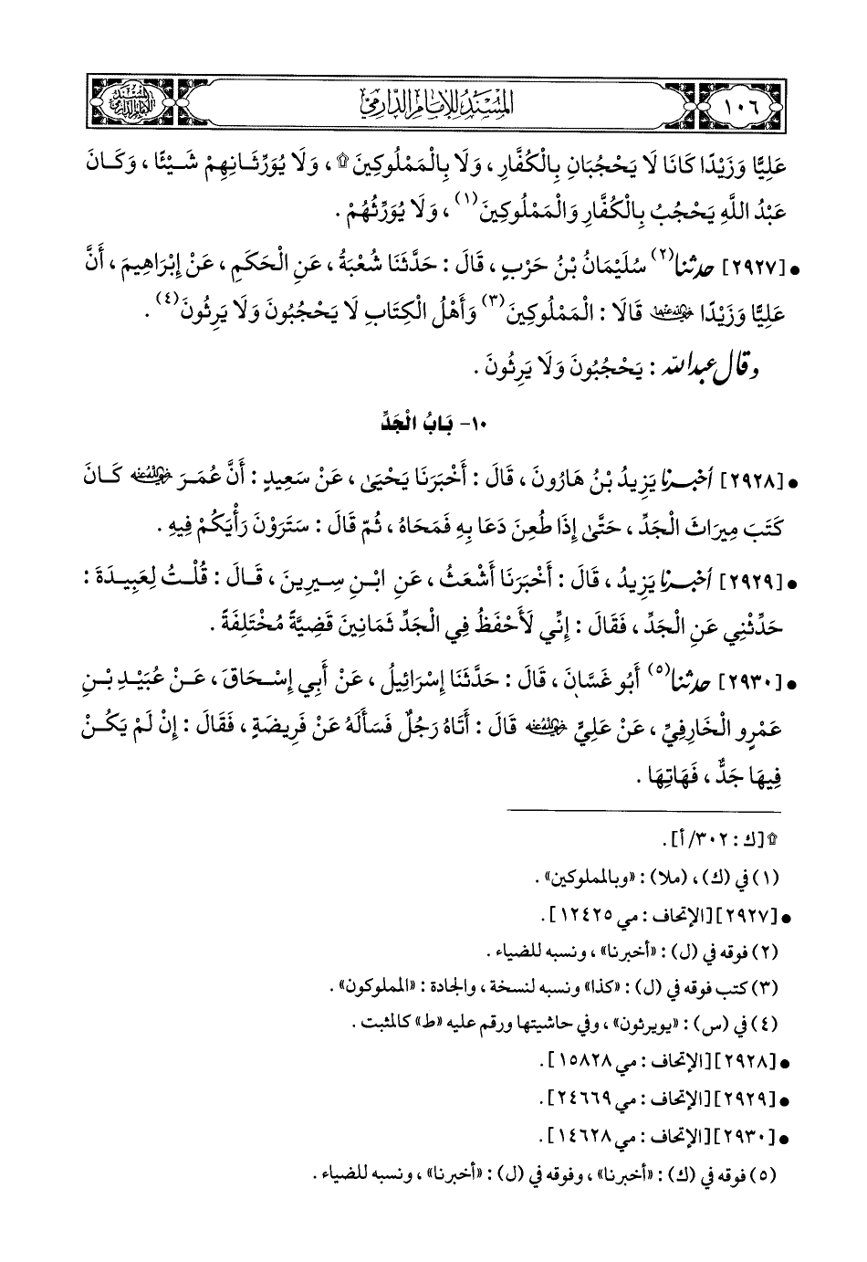 2927- أَخبَرَنا سُلَيْمَانُ بْنُ حَرْبٍ, قَالَ: حَدَّثَنَا شُعْبَةُ, عَنِ الْحَكَمِ, عَنْ إِبْرَاهِيمَ؛ أَنَّ عَلِيًّا, وَزَيْدًا رَضِيَ اللهُ عَنْهُمَا قَالاَ: الْمَمْلُوكِينَ (1) وَأَهْلُ الْكِتَابِ لاَ يَحْجُبُونَ, وَلاَ يَرِثُونَ.