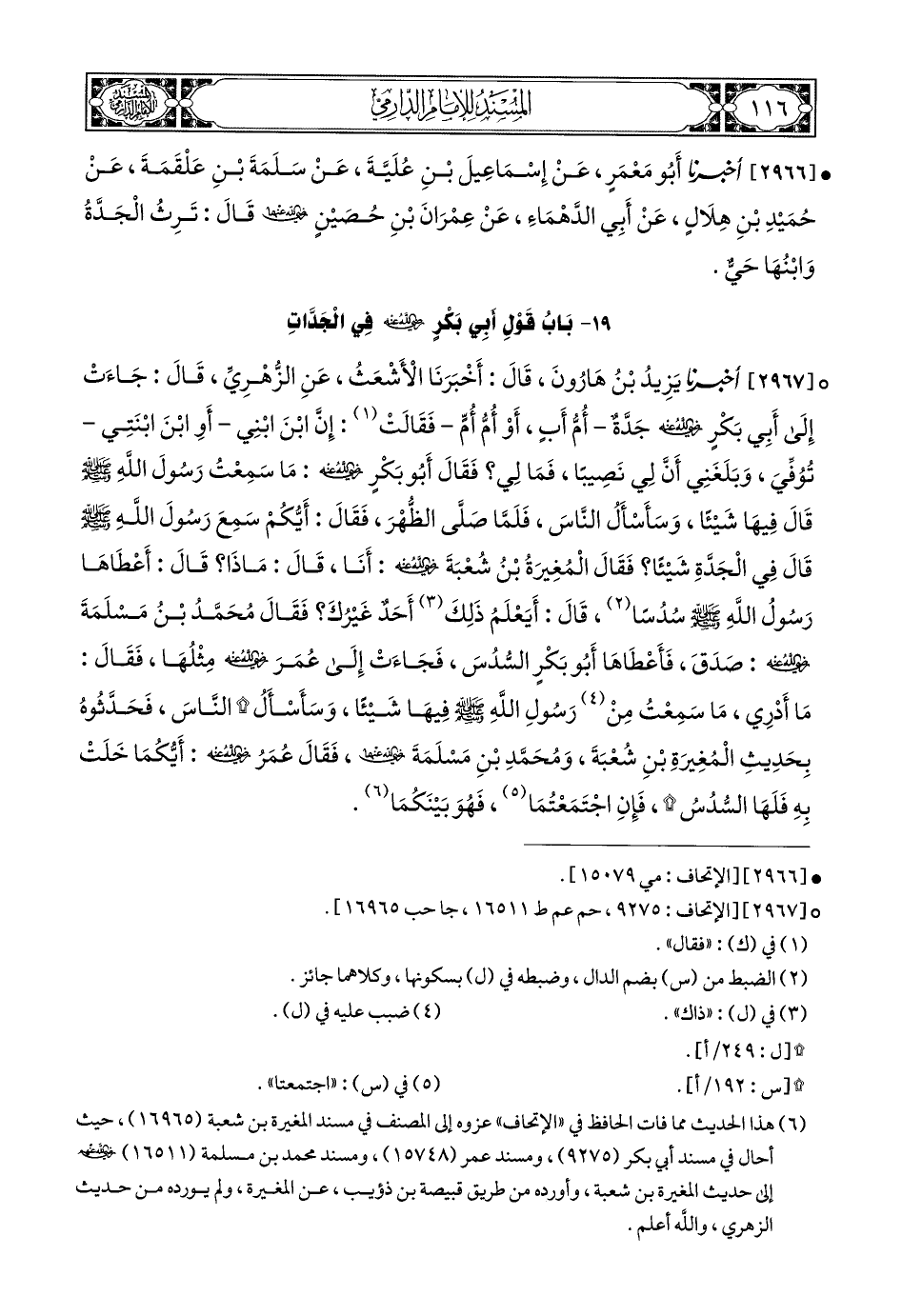 2967- أَخبَرَنا يَزِيدُ بْنُ هَارُونَ, قَالَ: أَخبَرَنا الأَشْعَثُ, عَنِ الزُّهْرِيِّ, قَالَ: جَاءَتْ إِلَى أَبِي بَكْرٍ جَدَّةٌ أُمُّ أَبٍ, أَوْ أُمُّ أُمٍّ, فَقَالَتْ: إِنَّ ابْنَ ابْنِي, أَوِ ابْنَ ابْنَتِي تُوُفِّيَ, وَبَلَغَنِي أَنَّ لِي نَصِيبًا, فَمَا لِي؟ فَقَالَ أَبُو بَكْرٍ رَضِيَ اللهُ عَنْهُ: مَا سَمِعْتُ رَسُولَ اللهِ صَلى الله عَليهِ وسَلم قَالَ فِيهَا شَيْئًا, وَسَأَسْأَلُ النَّاسَ, فَلَمَّا صَلَّى الظُّهْرَ, فَقَالَ (2): أَيُّكُمْ سَمِعَ رَسُولَ اللهِ صَلى الله عَليهِ وسَلم قَالَ فِي الْجَدَّةِ شَيْئًا؟ فَقَالَ الْمُغِيرَةُ بْنُ شُعْبَةَ رَضِيَ اللهُ عَنْهُ: أَنَا, قَالَ: مَاذَا؟ قَالَ: أَعْطَاهَا رَسُولُ اللهِ صَلى الله عَليهِ وسَلم سُدُسًا, قَالَ: أَيَعْلَمُ ذَلِكَ (3) أَحَدٌ غَيْرُكَ؟ فَقَالَ مُحَمَّدُ بْنُ مَسْلَمَةَ رَضِيَ اللهُ عَنْهُ: صَدَقَ, فَأَعْطَاهَا أَبُو بَكْرٍ السُّدُسَ.