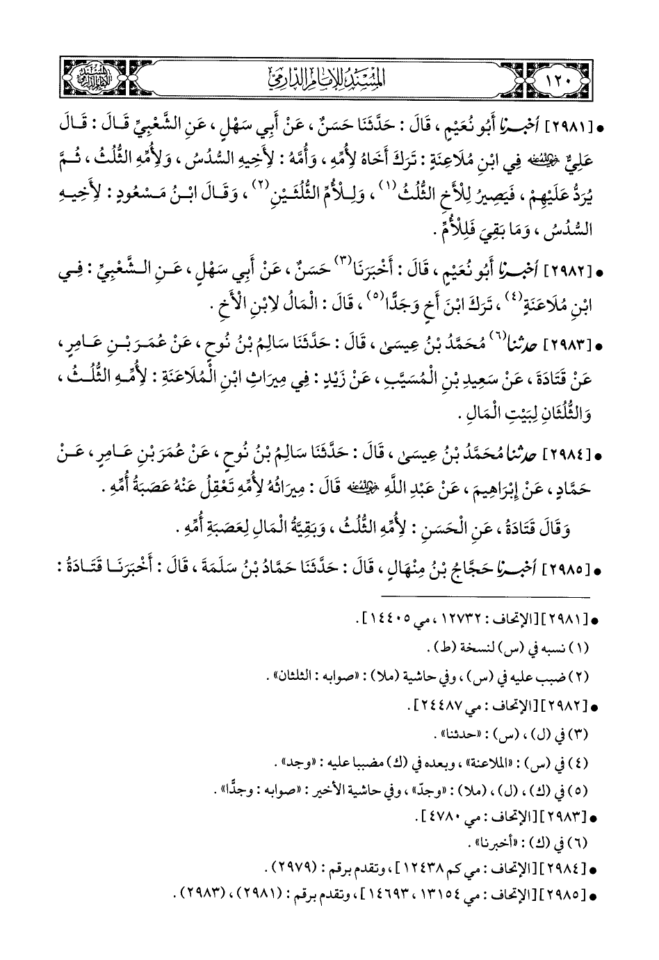 2985- أَخبَرَنا حَجَّاجُ بْنُ مِنْهَالٍ, قَالَ: حَدَّثَنَا حَمَّادُ بْنُ سَلَمَةَ, قَالَ: أَخبَرَنا قَتَادَةُ, أَنَّ عَلِيًّا, وَابْنَ مَسْعُودٍ رَضِيَ اللهُ عَنْهُمَا قَالاَ فِي وَلَدِ مُلاَعَنَةٍ تَرَكَ جَدَّتَهُ وَإِخْوَتَهُ لأُمِّهِ, قَالاَ (1): لِلْجَدَّةِ الثُّلُثُ, وَلِلإِخْوَةِ الثُّلُثَانِ.