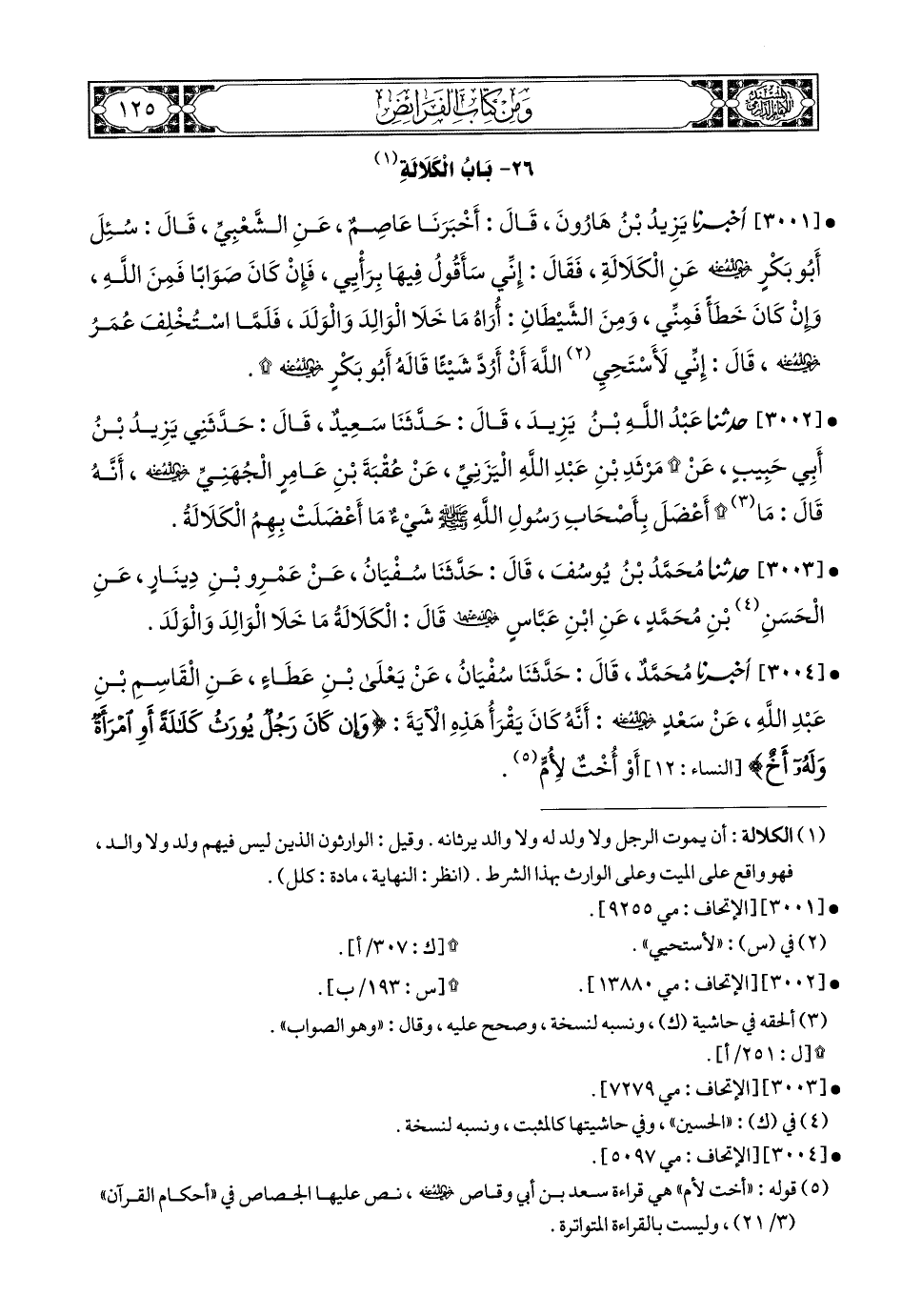3002- حَدَّثَنَا عَبْدُ اللهِ بْنُ يَزِيدَ, قَالَ: حَدَّثَنَا سَعِيدٌ (1), قَالَ: حَدَّثَنِي (2) يَزِيدُ بْنُ أَبِي حَبِيبٍ, عَنْ مَرْثَدِ بْنِ عَبْدِ اللهِ الْيَزَنِيِّ, عَنْ عُقْبَةَ بْنِ عَامِرٍ الْجُهَنِيِّ رَضِيَ اللهُ عَنْهُ أَنَّهُ قَالَ: مَا أَعْضَلَ بِأَصْحَابِ رَسُولِ اللهِ صَلى الله عَليهِ وسَلم شَيْءٌ, مَا أَعْضَلَتْ بِهِمُ الْكَلاَلَةُ.