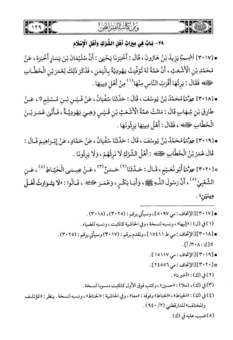 3017- أَخبَرَنا يَزِيدُ بْنُ هَارُونَ, قَالَ: أَخبَرَنا يَحْيَى (1), أَنَّ سُلَيْمَانَ بْنَ يَسَارٍ أَخْبَرَهَ, عَنْ مُحَمَّدِ بْنِ الأَشْعَثِ, أَنَّ عَمَّةً لَهُ تُوُفِّيَتْ يَهُوَدِيَّةً بِالْيَمَنِ, فَذَكَرَ ذَلِكَ لِعُمَرَ بْنِ الْخَطَّابِ رَضِيَ اللهُ عَنْهُ, فَقَالَ: يَرِثُهَا أَقْرَبُ النَّاسِ مِنْهَا (2) مِنْ أَهْلِ دِينِهَا.