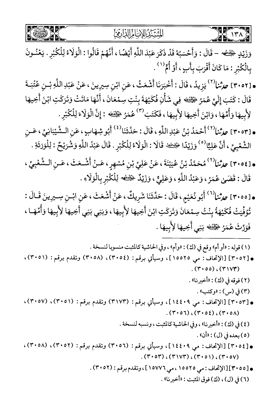 3052- حَدَّثَنَا يَزِيدُ (1), قَالَ: أَخبَرَنا أَشْعَثُ, عَنِ ابْنِ سِيرِينَ, عَنْ عَبْدِ اللهِ بْنِ عُتْبَةَ, قَالَ: كُتِبَ إِلَيَّ عُمَرُ رَضِيَ اللهُ عَنْهُ فِي شَأَنِ فُكَيْهَةَ بِنْتِ سَمْعَانَ, أَنَّهَا مَاتَتْ وَتَرَكَتِ ابْنَ أَخِيهَا لأَبِيهَا وَأُمِّهَا وَابْنَ أَخِيهَا لأَبِيهَا, فَكَتَبَ عُمَرُ رَضِيَ اللهُ عَنْهُ: إِنَّ الْوَلاَءَ لِلْكُبْرِ.