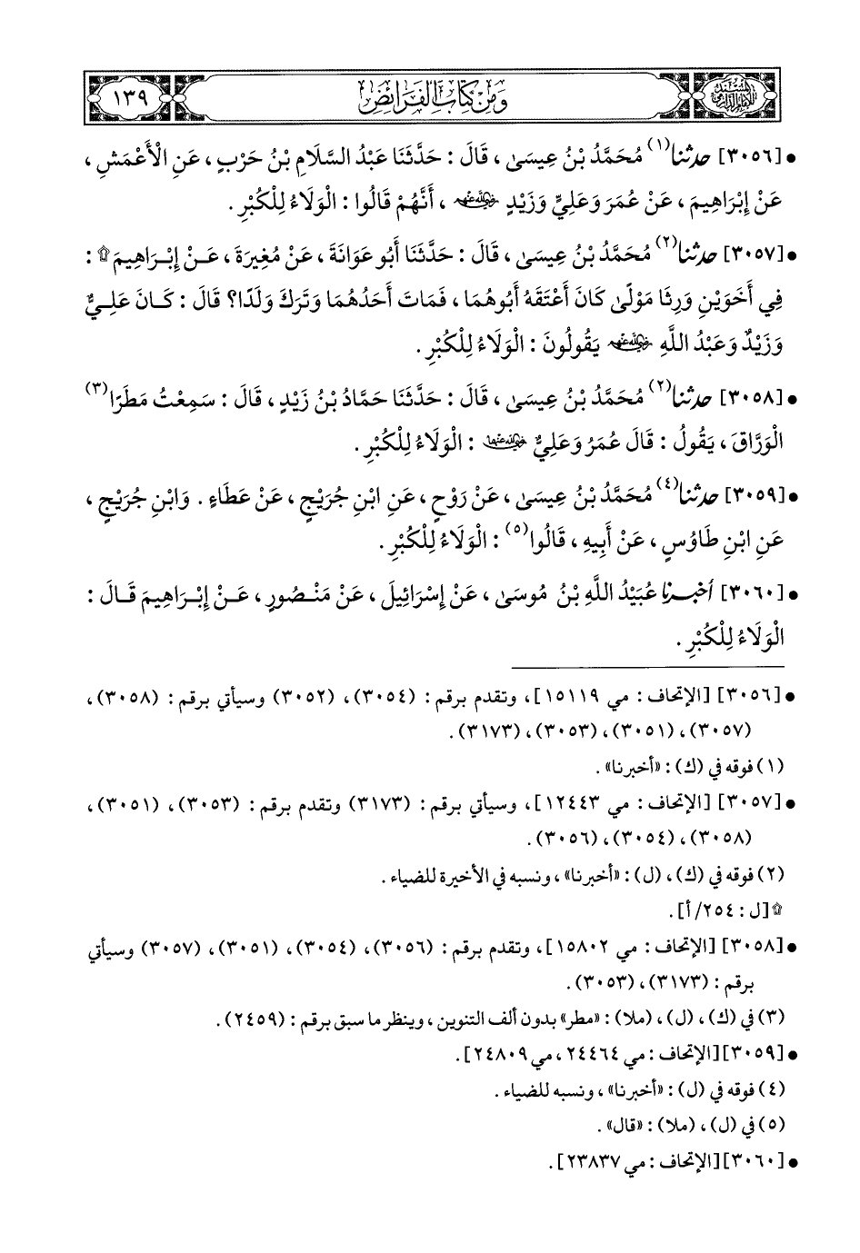 3056- حَدَّثَنَا مُحَمَّدُ بْنُ عِيسَى, قَالَ: حَدَّثَنَا عَبْدُ السَّلاَمِ بْنُ حَرْبٍ, عَنِ الأَعْمَشِ, عَنْ إِبْرَاهِيمَ, عَنْ عُمَرَ, وَعَلِيٍّ, وَزَيْدٍ رَضِيَ اللهُ عَنْهُمْ, أَنَّهُمْ قَالُوا: الْوَلاَءُ لِلْكُبْرِ (1).