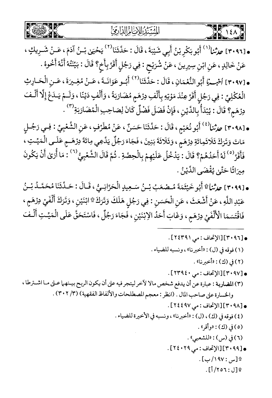 3098- أَخبَرَنا أَبُو نُعَيْمٍ, قَالَ: حَدَّثَنَا حَسَنٌ, عَنْ مُطَرِّفٍ, عَنِ الشَّعْبِيِّ فِي رَجُلٍ مَاتَ وَتَرَكَ ثَلاَثَ مِئَةِ دِرْهَمٍ وَثَلاَثَةَ بَنِينَ, فَجَاءَ رَجُلٌ يَدَّعِي مِئَةَ دِرْهَمٍ عَلَى الْمَيِّتِ, فَأَقَرَّ لَهُ أَحَدُهُمْ, قَالَ: يَدْخُلُ عَلَيْهِمْ بِالْحِصَّةِ, ثُمَّ قَالَ الشَّعْبِيُّ: مَا أُرَى أَنْ يَكُونَ مِيرَاثًا, حَتَّى يُقْضَى الدَّيْنُ.