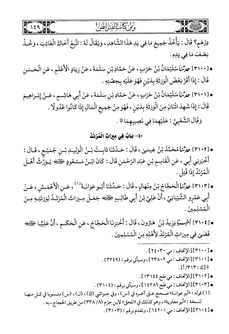 3103- حَدَّثَنَا الْحَجَّاجُ بْنُ مِنْهَالٍ, قَالَ: حَدَّثَنَا أَبُو عَوَانَةَ (1), عَنِ الأَعْمَشِ, عَنْ أَبِي عَمْرٍو الشَّيْبَانِيِّ, أَنَّ عَلِيَّ بْنَ أَبِي طَالِبٍ رَضِيَ اللهُ عَنْهُ جَعَلَ مِيرَاثَ الْمُرْتَدِّ لِوَرَثَتِهِ مِنَ الْمُسْلِمِينَ.