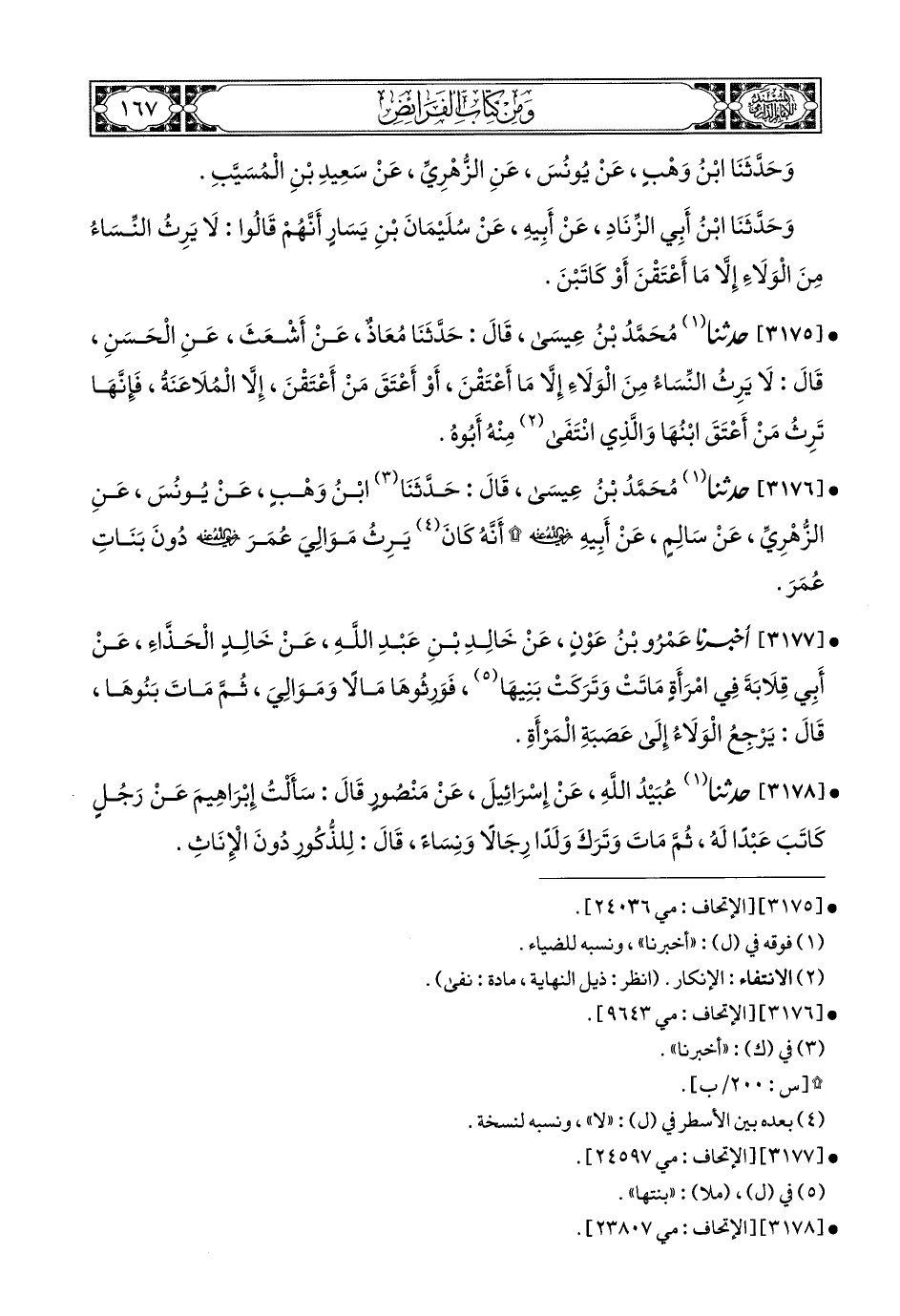 3176- حَدَّثَنَا مُحَمَّدُ بْنُ عِيسَى, قَالَ: حَدَّثَنَا ابْنُ وَهْبٍ, عَنْ يُونُسَ, عَنِ الزُّهْرِيِّ, عَنْ سَالِمٍ, عَنْ أَبِيهِ رَضِيَ اللهُ عَنْهُ أَنَّهُ كَانَ يَرِثُ (1) مَوَالِيَ عُمَرَ رَضِيَ اللهُ عَنْهُ دُونَ بَنَاتِ عُمَرَ.