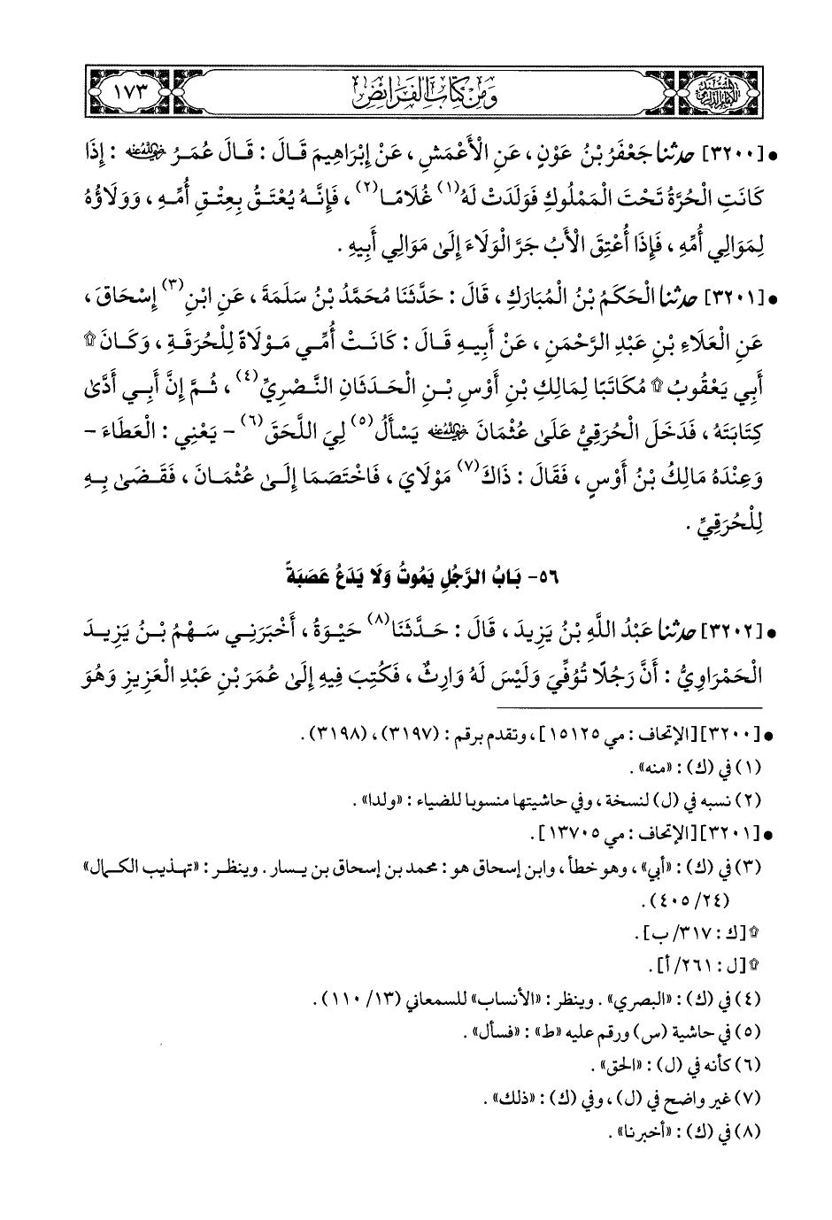 3201- حَدَّثَنَا الْحَكَمُ بْنُ الْمُبَارَكِ, قَالَ: حَدَّثَنَا مُحَمَّدُ بْنُ سَلَمَةَ, عَنِ ابْنِ إِسْحَاقَ, عَنِ الْعَلاَءِ بْنِ عَبْدِ الرَّحْمَنِ, عَنْ أَبِيهِ قَالَ: كَانَتْ أُمِّي مَوْلاَةً لِلْحُرَقَةِ, وَكَانَ أَبِي يَعْقُوبُ مُكَاتَبًا لِمَالِكِ بْنِ أَوْسِ بْنِ الْحَدَثَانِ النَّصْرِيِّ, ثُمَّ إِنَّ أَبِي أَدَّى كِتَابَتَهُ, فَدَخَلَ الْحُرَقِيُّ عَلى عُثْمَانَ رَضِيَ اللهُ عَنْهُ, يَسَأَلُ لِيَ اللَّحَقَ (1), يَعْنِي: الْعَطَاءَ, وَعِنْدَهُ مَالِكُ بْنُ أَوْسٍ, فَقَالَ: ذَاكَ (2) مَوْلاَيَ, فَاخْتَصَمَا إِلَى عُثْمَانَ, فَقَضَى بِهِ لِلْحُرَقِيِّ.