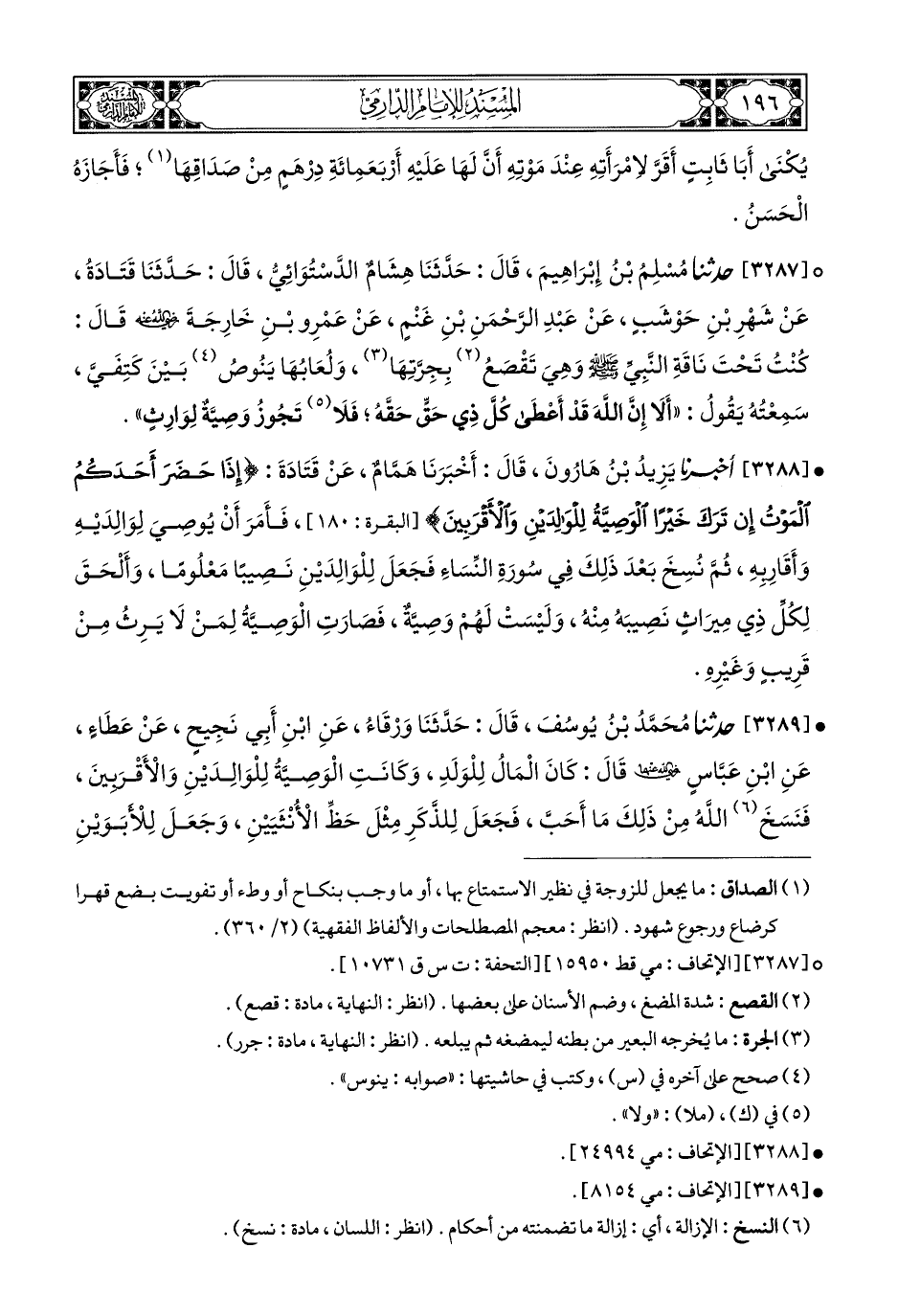3288- أَخبَرَنا يَزِيدُ بْنُ هَارُونَ, قَالَ: أَخبَرَنا هَمَّامٌ, عَنْ قَتَادَةَ (1): {إِذَا حَضَرَ أَحَدَكُمُ الْمَوْتُ إِنْ تَرَكَ خَيْرًا الْوَصِيَّةُ لِلْوَالِدَيْنِ وَالأَقْرَبِينَ} (2), فَأَمَرَ أَنْ يُوصِيَ لِوَالِدَيْهِ وَأَقَارِبِهِ, ثُمَّ نُسِخَ بَعْدَ ذَلِكَ فِي سُورَةِ النِّسَاءِ, فَجَعَلَ لِلْوَالِدَيْنِ نَصِيبًا مَعْلُومًا, وَأَلْحَقَ لِكُلِّ ذِي مِيرَاثٍ نَصِيبَهُ مِنْهُ, وَلَيْسَتْ لَهُمْ وَصِيَّةٌ, فَصَارَتِ الْوَصِيَّةُ لِمَنْ لاَ يَرِثُ مِنْ قَرِيبٍ وَغَيْرِهِ.