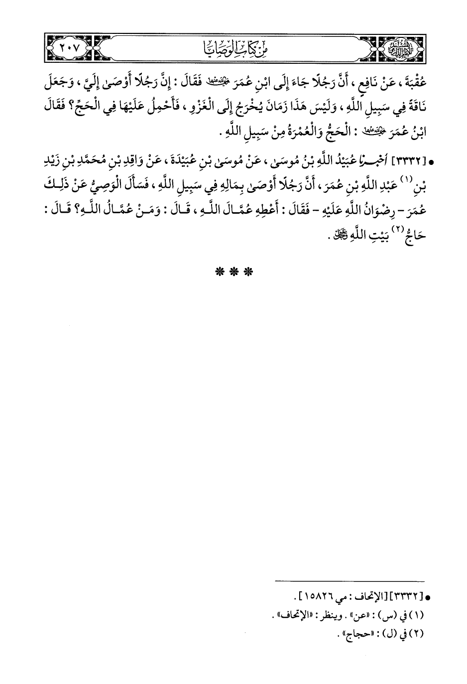 3332- أَخبَرَنا عُبَيْدُ اللهِ بْنُ مُوسَى, عَنْ مُوسَى بْنِ عُبَيْدَةَ, عَنْ وَاقِدِ بْنِ مُحَمَّدِ بْنِ زَيْدٍ بن عَبْدِ الله بْنِ عُمَرَ, أَنَّ رَجُلًا أَوْصَى بِمَالِهِ فِي سَبِيلِ الله, فَسَأَلَ الْوَصِيُّ عَنْ ذَلِكَ عُمَرَ رضوان الله عليه, فَقَالَ: أَعْطِهِ عُمَّالَ الله, قَالَ: وَمَنْ عُمَّالُ الله؟ قَالَ: حَاجُّ بَيْتِ الله عَزَّ وَجَلَّ.