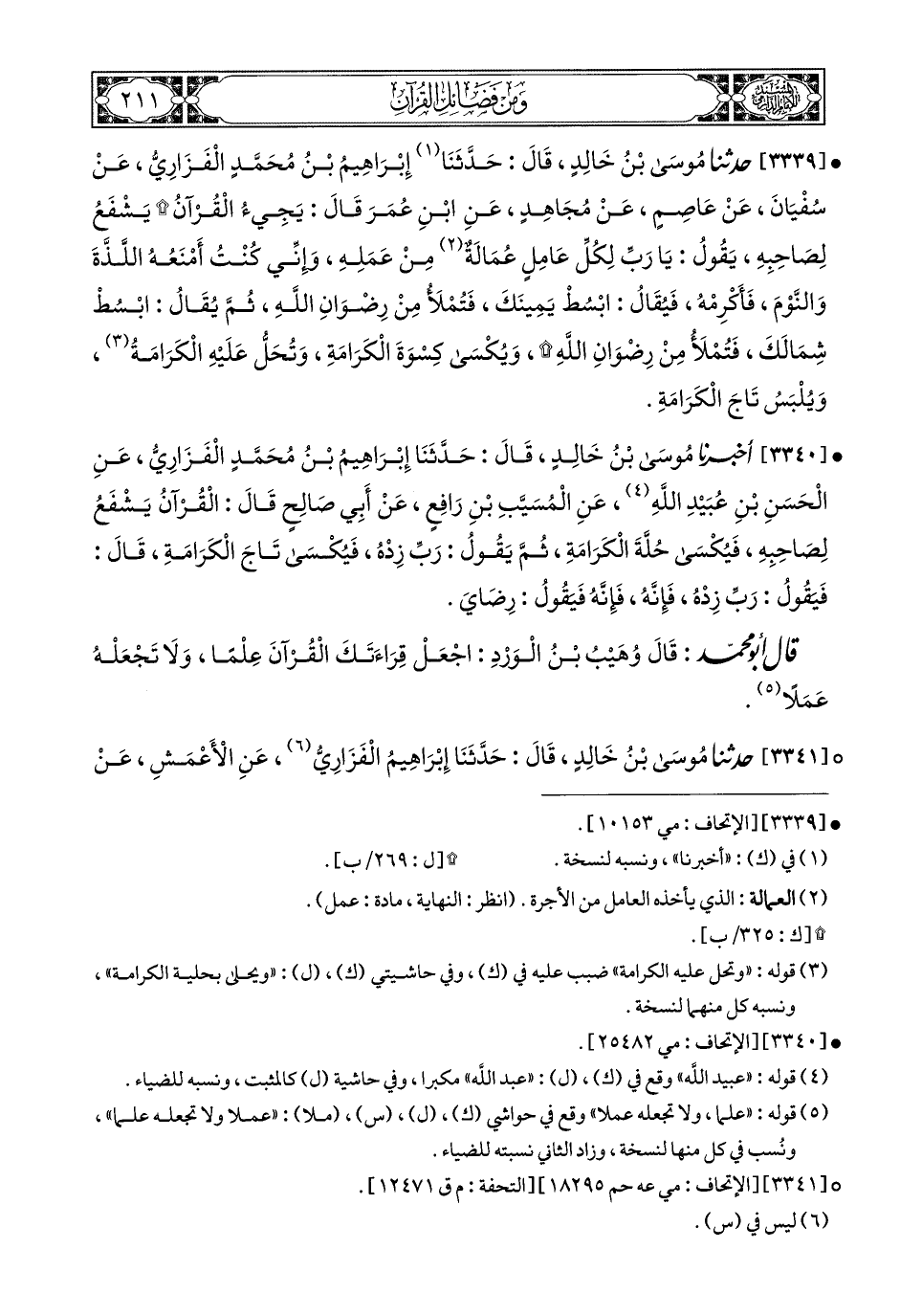 3339- حَدَّثَنَا مُوسَى بْنُ خَالِدٍ, قَالَ: حَدَّثَنَا إِبْرَاهِيمُ بْنُ مُحَمَّدٍ الْفَزَارِيُّ, عَنْ سُفْيَانَ, عَنْ عَاصِمٍ, عَنْ مُجَاهِدٍ, عَنِ ابْنِ عُمَرَ قَالَ: يَجِيءُ الْقُرْآنُ, يَشْفَعُ لِصَاحِبِهِ, يَقُولُ: يَا رَبِّ, لِكُلِّ عَامِلٍ عُمَالَةٌ مِنْ عَمَلِهِ, وَإِنِّي كُنْتُ أَمْنَعُهُ اللَّذَّةَ, وَالنَّوْمَ, فَأَكْرِمْهُ, فَيُقَالُ: ابْسُطْ يَمِينَكَ, فَتُمْلأُ مِنْ رِضْوَانِ الله, ثُمَّ يُقَالُ: ابْسُطْ شِمَالَكَ, فَتُمْلأُ مِنْ رِضْوَانِ الله, وَيُكْسَى كِسْوَةَ الْكَرَامَةِ, وَتُحَلُّ عَلَيْهِ الْكَرَامَةُ (1), وَيُلْبَسُ تَاجَ الْكَرَامَةِ.