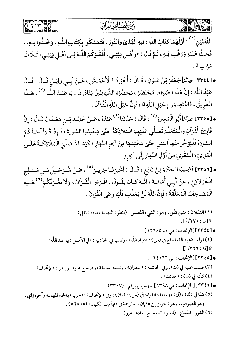 (2) قال محقق طبعة دار البشائر: ذكره الحافظ في الإتحاف واللفظ للحاكم في المستدرك: الصراط المستقيم هو كتاب الله.