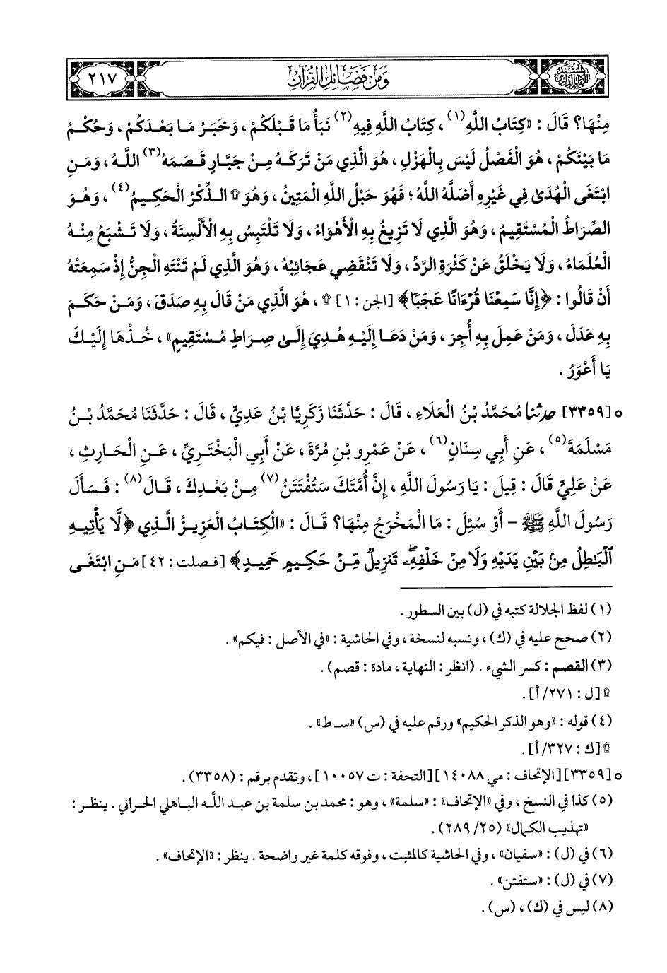 3359 - حَدَّثَنَا مُحَمَّدُ بْنُ الْعَلاَءِ, قَالَ: حَدَّثَنَا زَكَرِيَّا بْنُ عَدِيٍّ, قَالَ: حَدَّثَنَا مُحَمَّدُ بْنُ مَسْلَمَةَ (1) , عَنِ أَبِي سِنَانٍ, عَنْ عَمْرِو بْنِ مُرَّةَ, عَنْ أَبِي الْبَخْتَرِيِّ, عَنِ الْحَارِثِ, عَنْ عَلِيٍّ, قَالَ: قِيلَ: يَا رَسُولَ اللهِ, إِنَّ أُمَّتَكَ سَتُفْتَتَنُ مِنْ بَعْدِكَ, قَالَ: فَسَأَلَ رَسُولَ اللهِ صَلى الله عَليهِ وسَلم, أَوْ سُئِلَ: مَا الْمَخْرَجُ مِنْهَا؟ قَالَ: الْكِتَابُ الْعَزِيزُ الَّذِي {لاَ يَأْتِيهِ الْبَاطِلُ مِنْ بَيْنِ يَدَيْهِ وَلاَ مِنْ خَلْفِهِ تَنْزِيلٌ مِن حَكِيمٍ حَمِيدٍ} مَنِ ابْتَغَى الْهُدَى فِي غَيْرِهِ أَضَلَّهُ اللهُ (2) , وَمَنْ وَلِيَ هَذَا الأَمْرَ مِنْ جَبَّارٍ فَحَكَمَ بِغَيْرِهِ قَصَمَهُ اللهُ, هُوَ الذِّكْرُ الْحَكِيمُ, وَالنُّورُ الْمُبِينُ, وَالصِّرَاطُ الْمُسْتَقِيمُ, فِيهِ خَبَرُ مَنْ قَبْلَكُمْ, وَنَبَأُ مَا بَعْدَكُمْ, وَحُكْمُ مَا بَيْنَكُمْ, وَهُوَ الْفَصْلُ, لَيْسَ بِالْهَزْلِ, وَهُوَ الَّذِي سَمِعَتْهُ الْجِنُّ فَلَمْ تَنَاهَا (3) أَنْ قَالُوا: {إِنَّا سَمِعْنَا قُرْآنًا عَجَبًا يَهْدِي إِلَى الرُّشْدِ} (4) , لاَ (5) يَخْلَقُ عَنْ كَثْرَةِ الرَّدِّ, وَلاَ تَنْقَضِي عِبَرُهُ, وَلاَ تَفْنَى عَجَائِبُهُ, ثُمَّ قَالَ عَلِيٌّ لِلْحَارِثِ: خُذْهَا يَا أَعْورُ.
