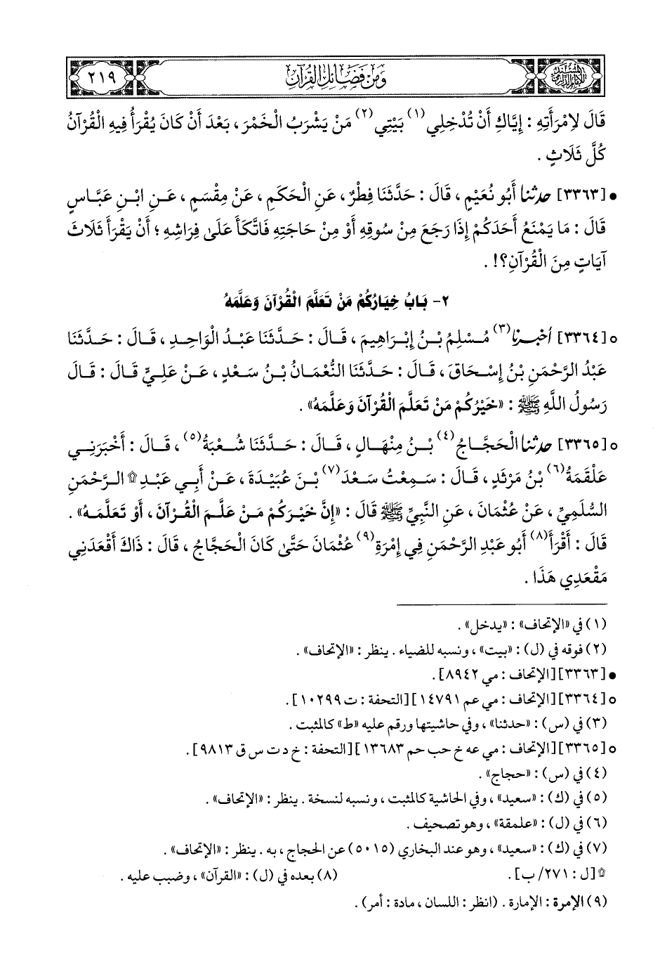 3365- حَدَّثَنَا الْحَجَّاجُ بْنُ مِنْهَالٍ, قَالَ: حَدَّثَنَا شُعْبَةُ, قالَ: أَخبَرَنِي عَلْقَمَةُ بْنُ مَرْثَدٍ قَالَ: سَمِعْتُ سَعْدَ بْنَ عُبَيْدَةَ, عَنْ أَبِي عَبْدِ الرَّحْمَنِ السُّلَمِيِّ, عَنْ عُثْمَانَ, عَنِ النَّبِيِّ صَلى الله عليه وسلم قَالَ: إِنَّ خَيْرَكُمْ مَنْ عَلَّمَ الْقُرْآنَ, أَوْ تَعَلَّمَهُ.