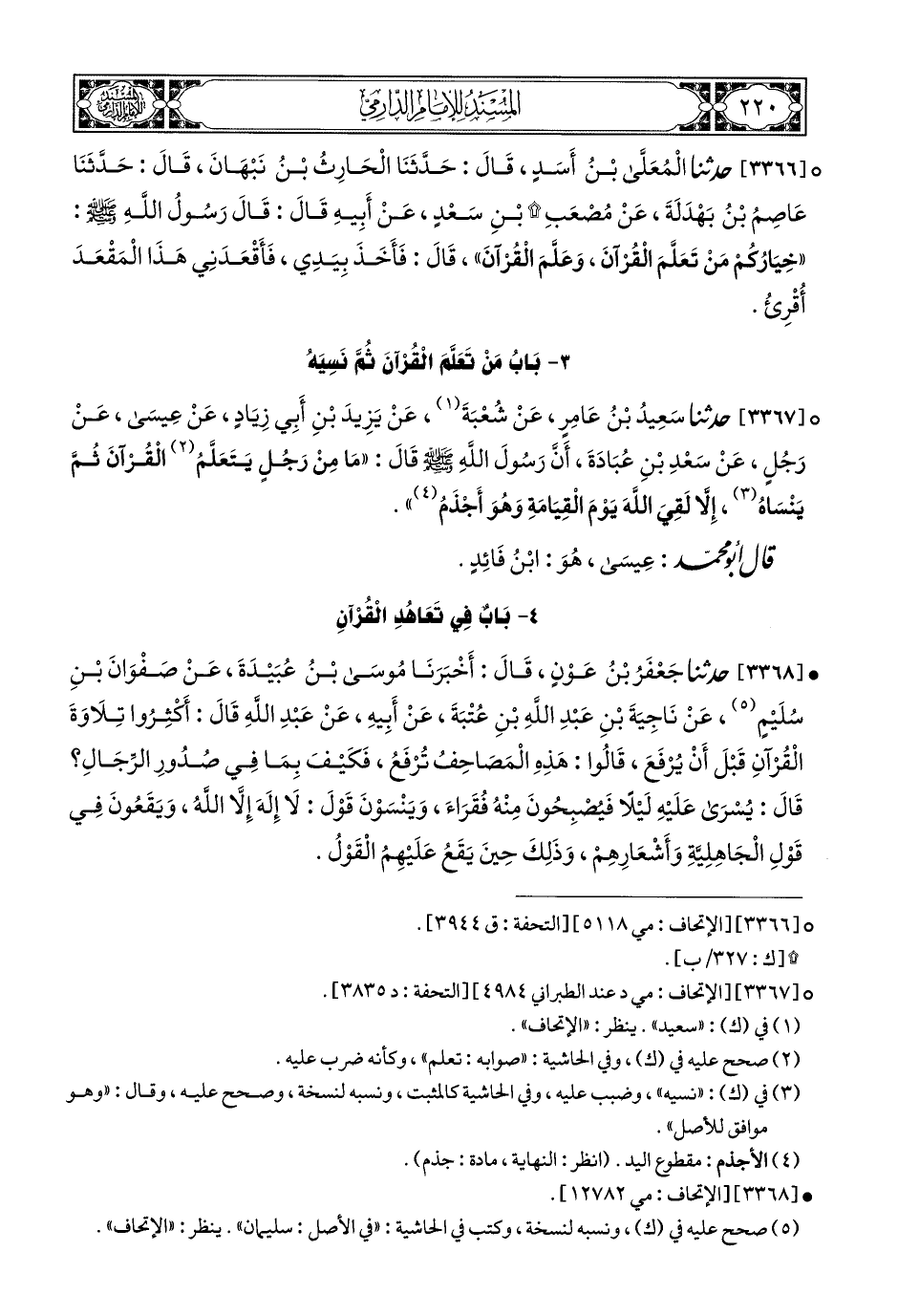 3366- حَدَّثَنَا الْمُعَلَّى بْنُ أَسَدٍ, قَالَ: حَدَّثَنَا الْحَارِثُ بْنُ نَبْهَانَ, قَالَ: حَدَّثَنَا عَاصِمُ بْنُ بَهْدَلَةَ, عَنْ مُصْعَبِ بْنِ سَعْدٍ, عَنْ أَبِيهِ قَالَ: قَالَ رَسُولُ الله صَلى الله عليه وسلم: خِيَارُكُمْ (1) مَنْ تَعَلَّمَ الْقُرْآنَ, وَعَلَّمَ الْقُرْآنَ.