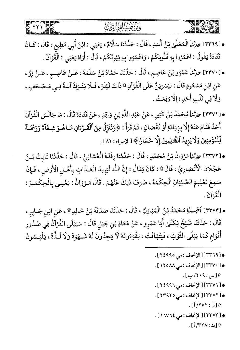 3369- حَدَّثَنَا الْمُعَلَّى بْنُ أَسَدٍ, قَالَ: حَدَّثَنَا سَلاَّمُ (1), يَعْنِي: ابْنَ أَبِي مُطِيعٍ, قَالَ: كَانَ قَتَادَةُ يَقُولُ: اعْمُرُوا بِهِ قُلُوبَكُمْ, وَاعْمُرُوا بِهِ بُيُوتَكُمْ.