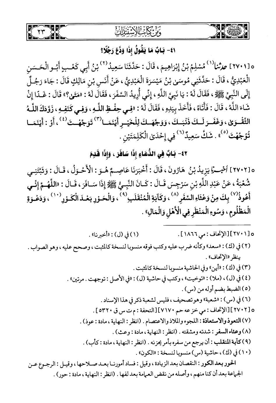 2701- حَدَّثَنَا مُسْلِمُ بْنُ إِبْرَاهِيمَ, قَالَ: حَدَّثَنَا سَعِيدُ بْنُ أَبِي كَعْبٍ, أَبُو الْحَسَنِ الْعَبْدِيُّ, قَالَ: حَدَّثَنِي مُوسَى بْنُ مَيْسَرَةَ الْعَبْدِيُّ, عَنْ أَنَسِ بْنِ مَالِكٍ, قَالَ: جَاءَ رَجُلٌ إِلَى النَّبِيِّ صَلى الله عَليهِ وسَلم, فَقَالَ لَهُ: يَا نَبِيَّ اللهِ, إِنِّي أُرِيدُ السَّفَرَ, فَقَالَ لَهُ: مَتَى؟ قَالَ: غَدًا إِنْ شَاءَ اللهُ, قَالَ: فَأَتَاهُ, فَأَخَذَهُ بِيَدِهِ, فَقَالَ لَهُ: فِي حِفْظِ اللهِ, وَفِي كَنَفِهِ زَوَّدَكَ اللهُ التَّقْوَى, وَغَفَرَ لَكَ ذَنْبَكَ, وَوَجَّهَكَ لِلْخَيْرِ أَيْنَمَا (1) تَوَجَّهْتَ, أَوْ أَيْنَمَا (2) تُوُجِّهْتَ.