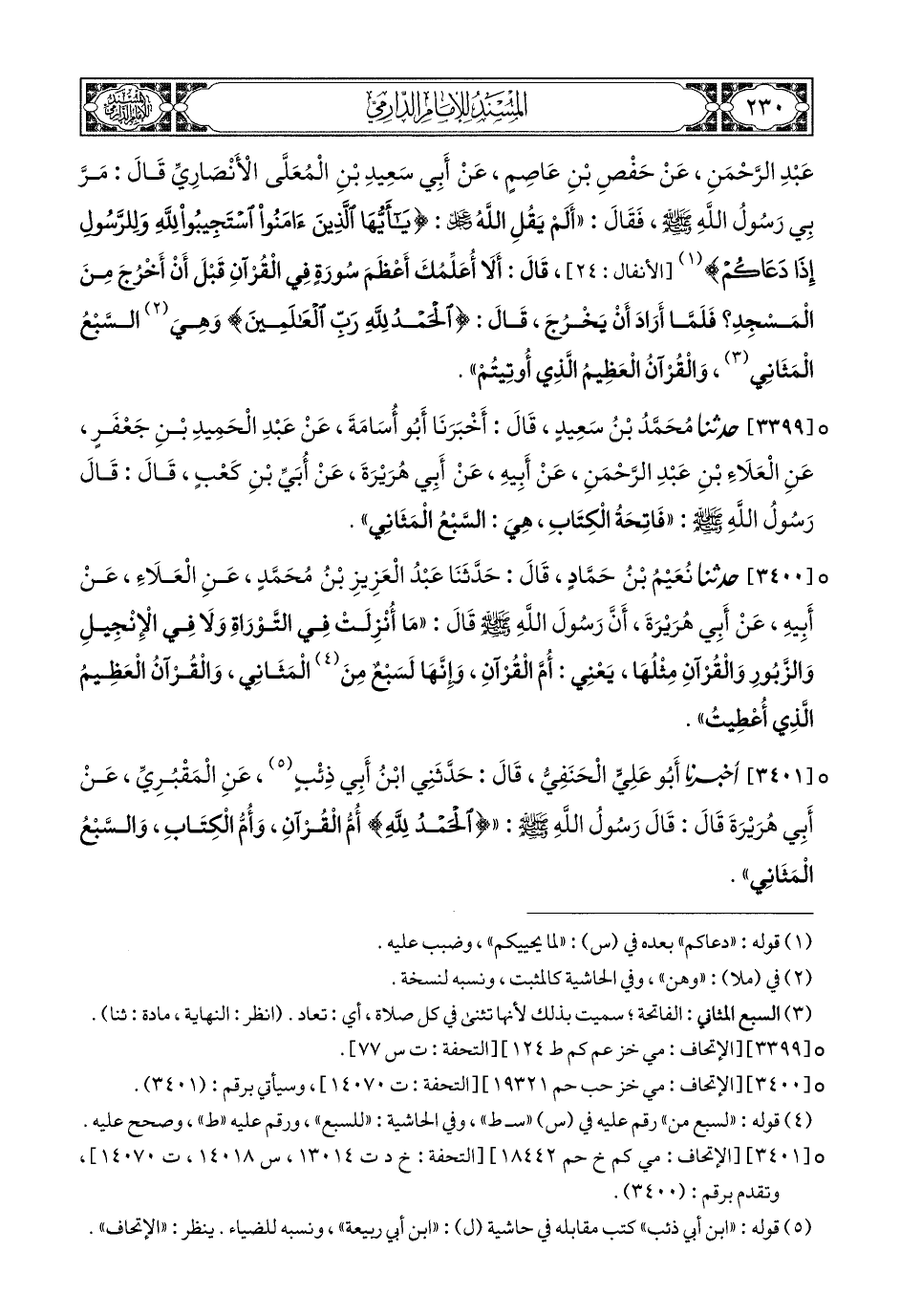 3401- أَخبَرَنا أَبُو عَلِيٍّ الْحَنَفِيُّ, قَالَ: حَدَّثَنِي ابْنُ أَبِي ذِئْبٍ, عَنِ الْمَقْبُرِيِّ, عَنْ أَبِي هُرَيْرَةَ قَالَ: قَالَ رَسُولُ الله صَلى الله عليه وسلم: {الْحَمْدُ لِلَّهِ} أُمُّ الْقُرْآنِ, وَأُمُّ الْكِتَابِ, وَالسَّبْعُ الْمَثَانِي.