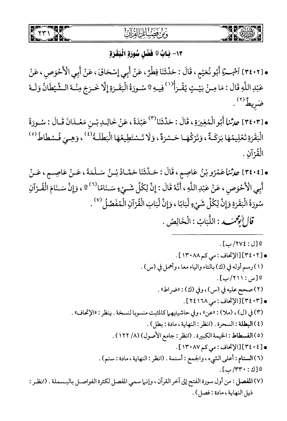 3402- أَخبَرَنا أَبُو نُعَيْمٍ, قَالَ: حَدَّثَنَا فِطْرٌ, عَنْ أَبِي إِسْحَاقَ, عَنْ أَبِي الأَحْوَصِ, عَنْ عَبْدِ الله قَالَ: مَا مِنْ بَيْتٍ يُقْرَأُ فِيهِ سُورَةُ الْبَقَرَةِ إِلاَّ خَرَجَ مِنْهُ الشَّيْطَانُ وَلَهُ ضَرِيطٌ (2).